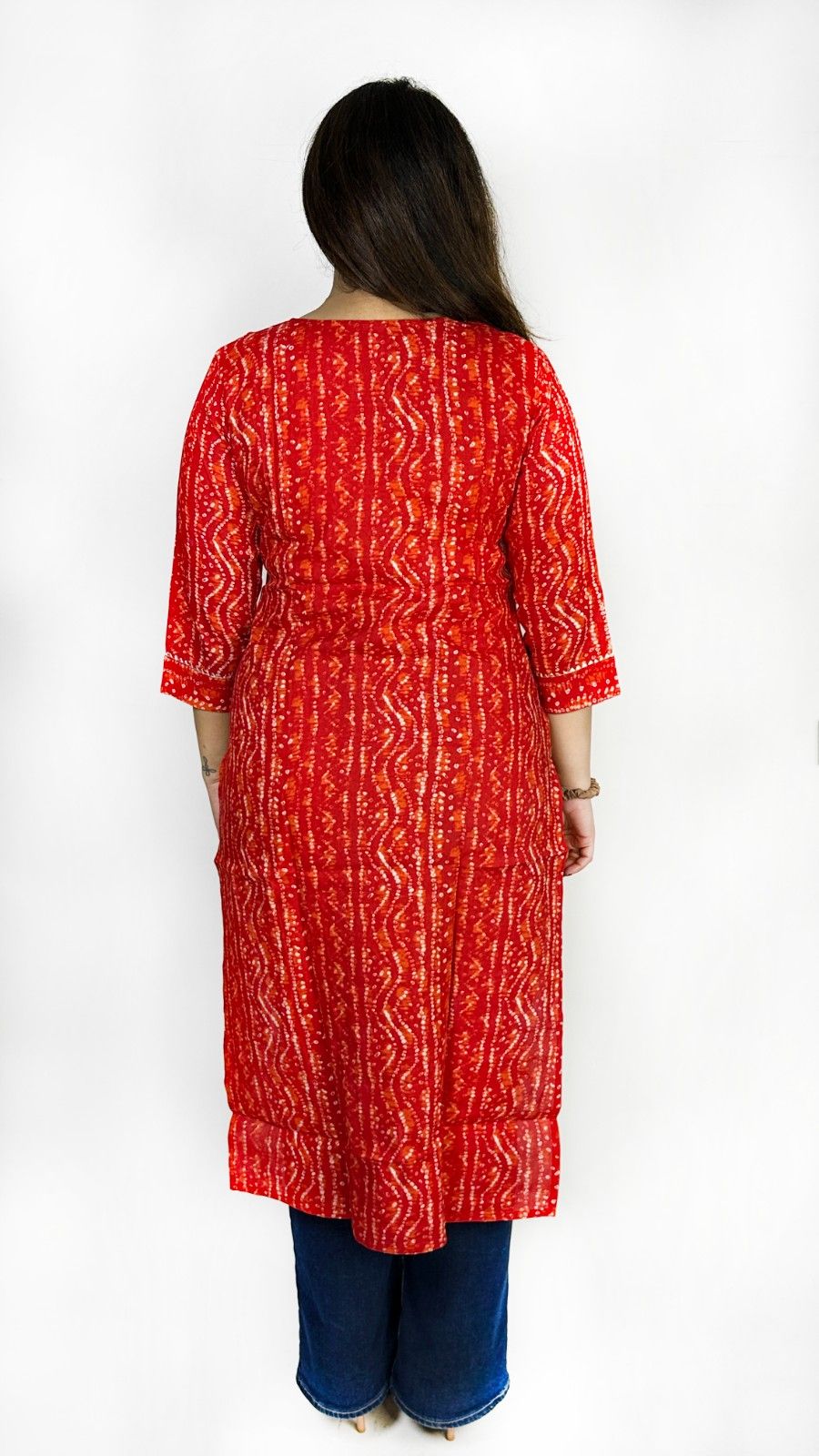 Cotton printed kurti with embellishment on the front for detailing. Breathable and well-suited for summers. It has 3/4th sleeves and round neck cut.