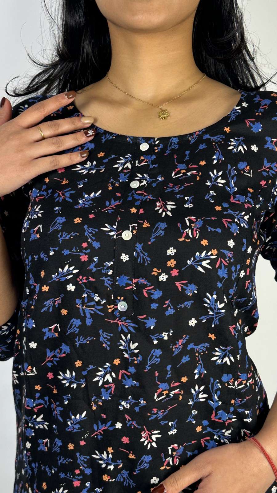 Cotton long kurti with buttons in the front for design only. It has 3/4th sleeves and round neck cut. Breathable and well-suited for summers.