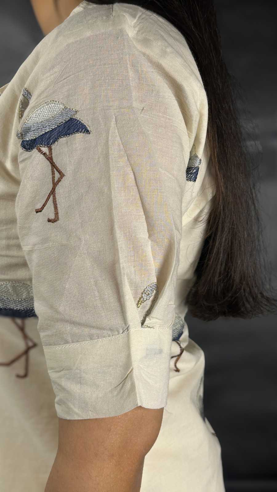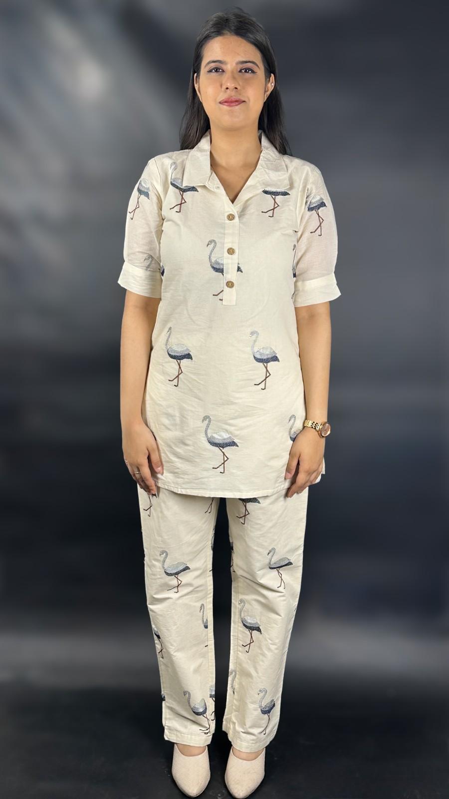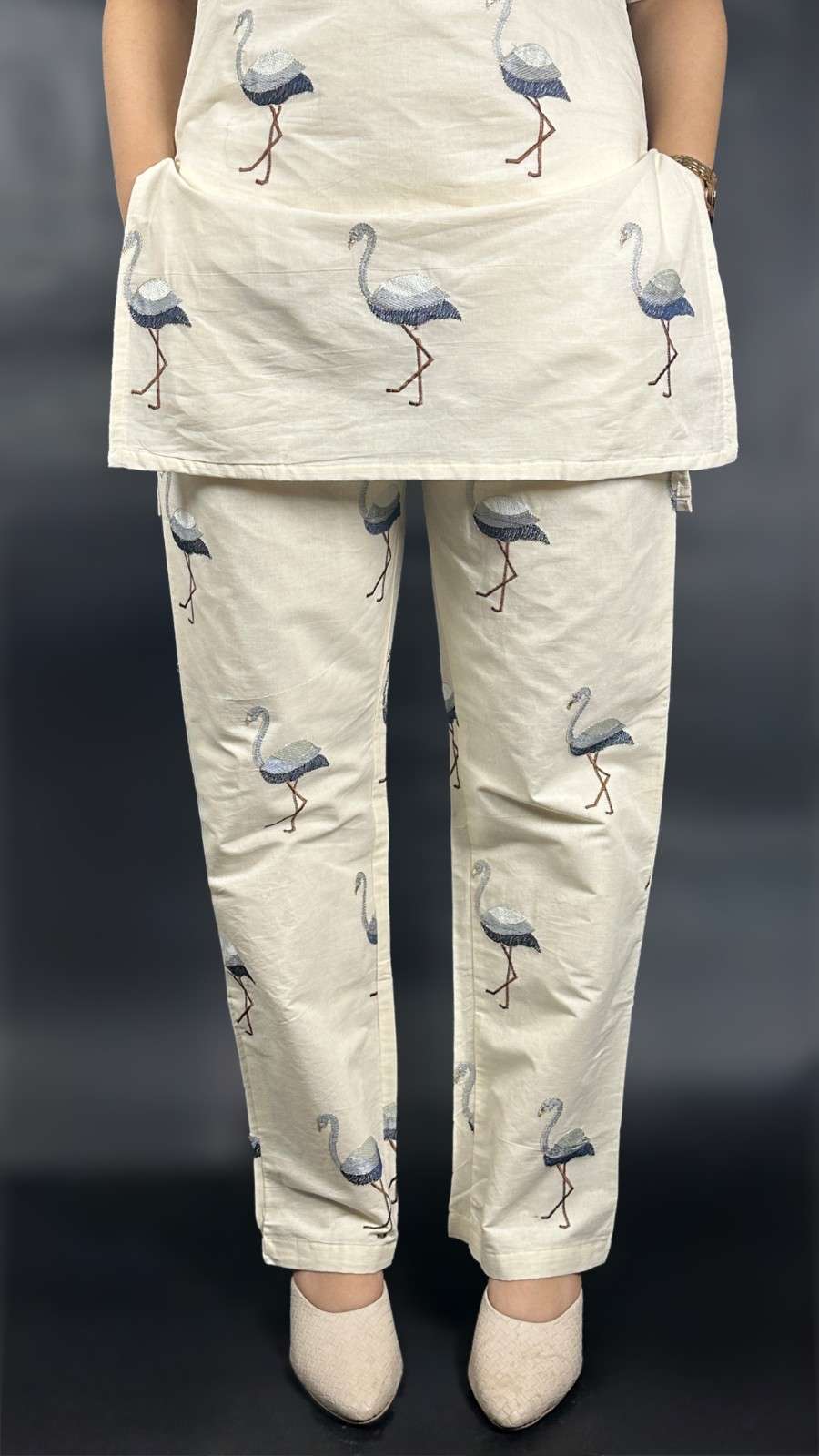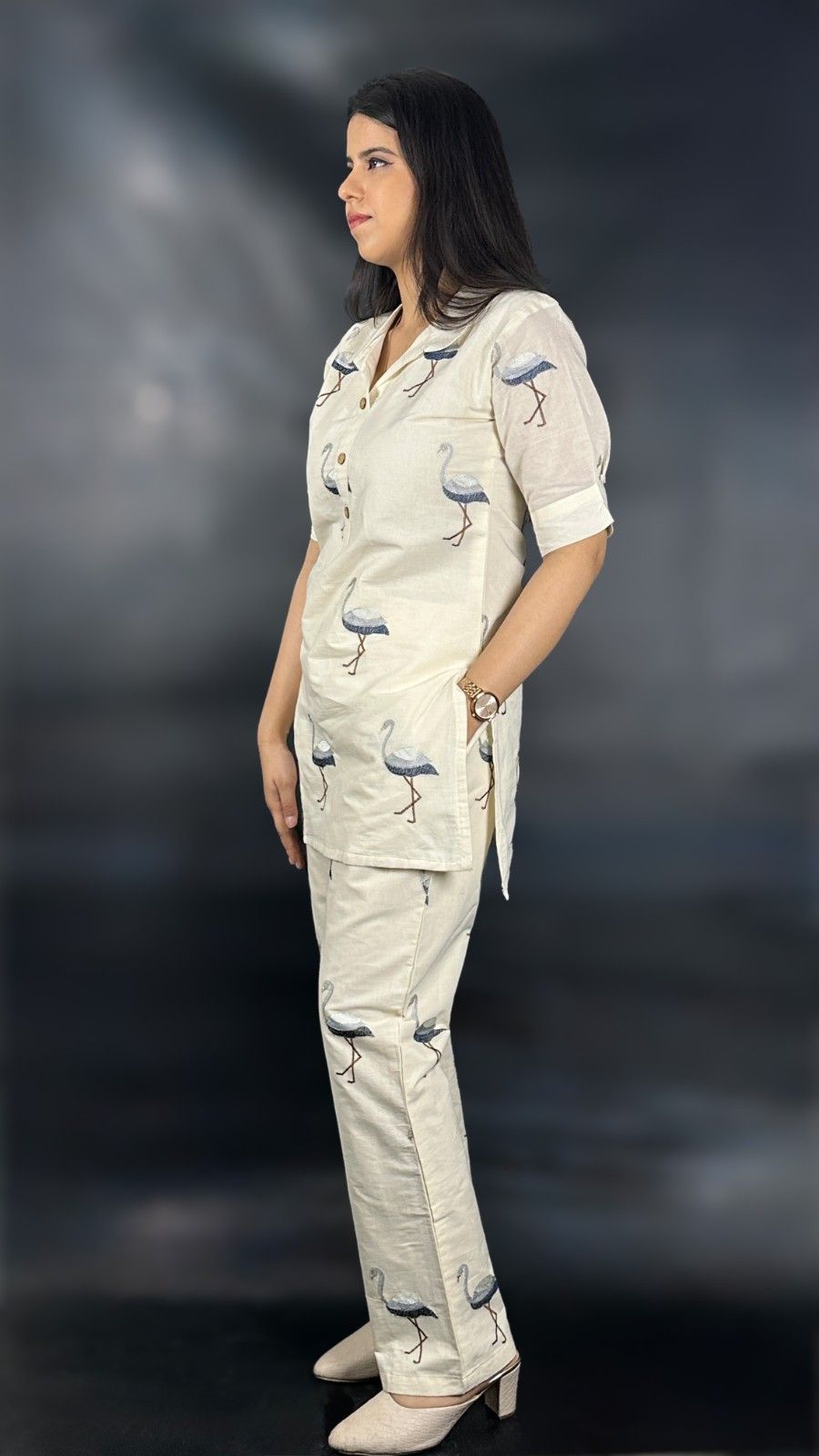 9586 Khadi Cotton Co-ord Set has a soft lining of cotton. The top has collar style, 1/2 sleeves and 3 botton placket down the collar. The Bottom has a pocket on each sides and has an elastic band on the back of the waist band for ease of fit. The entire outfit has machine embroidered swans stitched on it. It is suitable for travel and casual occasions in summer season.