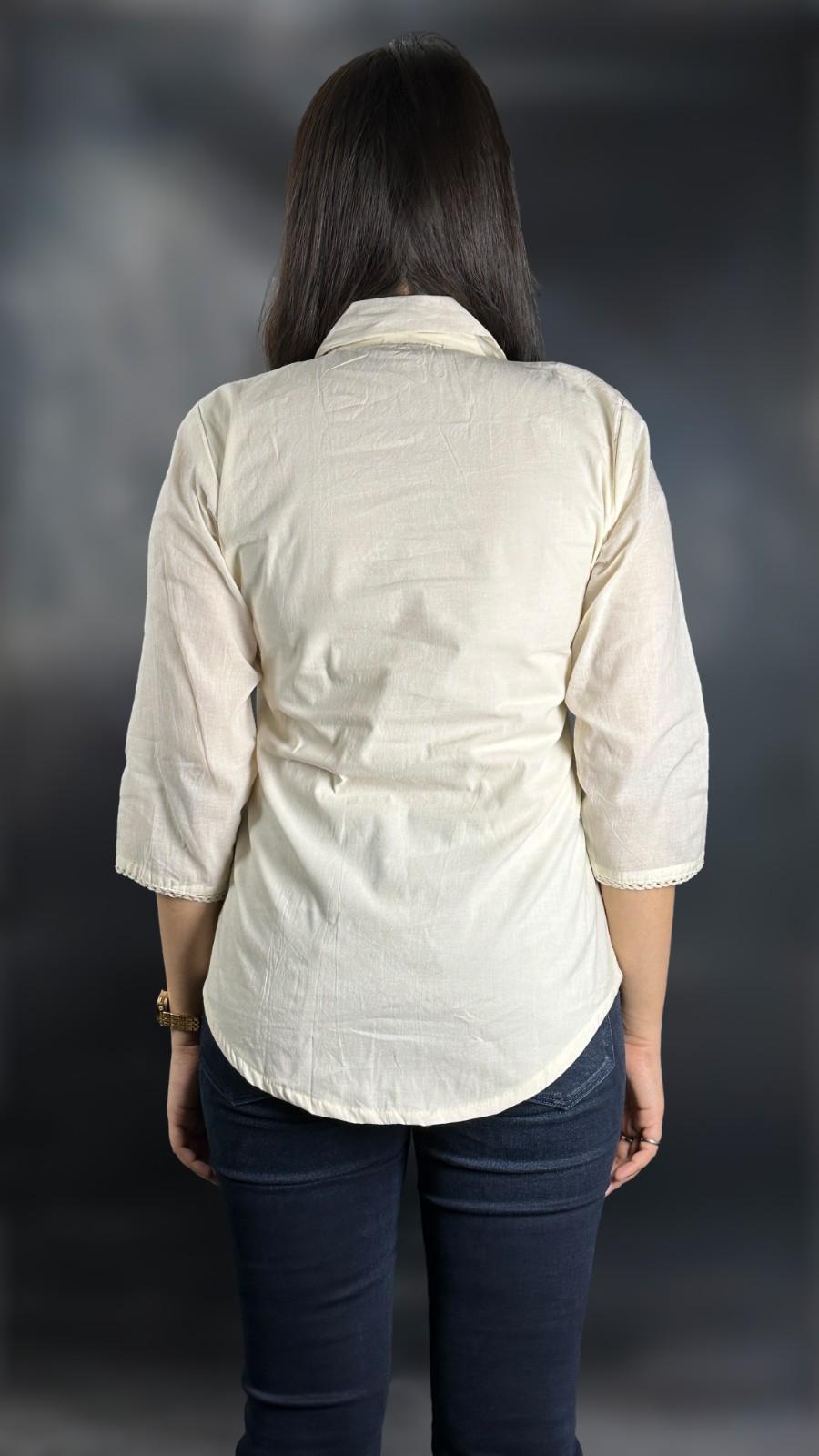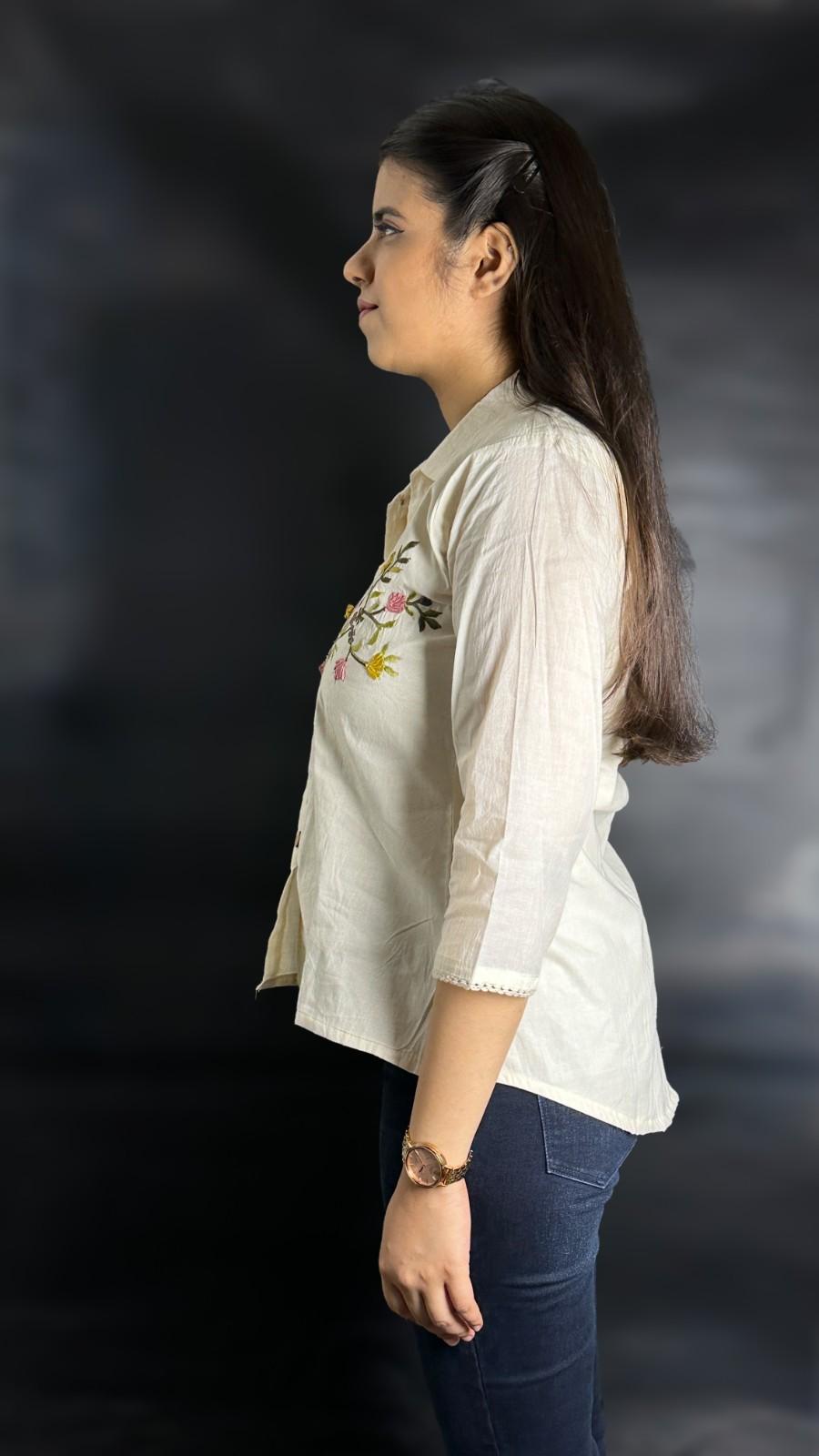 9586 Khadi Cotton Top has a soft lining of cotton. Comes with 3/4th sleeves and hand embroidered floral designs on it. It looks like a formal shirt, thus is suitable for formal events and for summers.