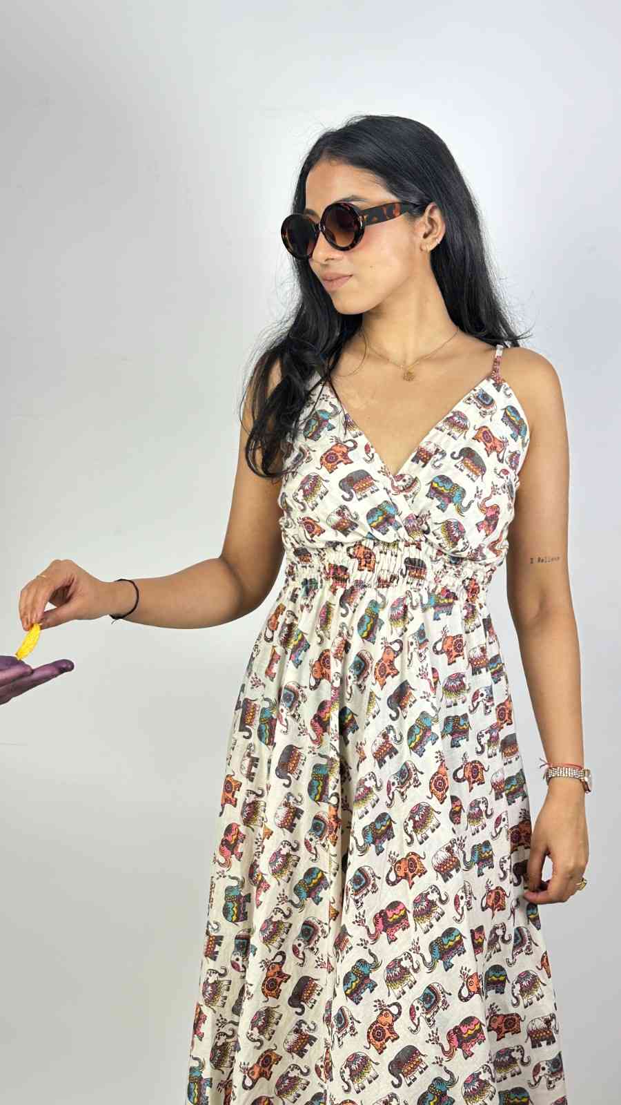 Cotton screen-printed cut-sleeves free-size dress with a botton flare. It fits upto L size requirements. It has gathers for relaxation and style, well- suited for summers. The straps are adjustable to have your desired neckline depth. Available in one more print.