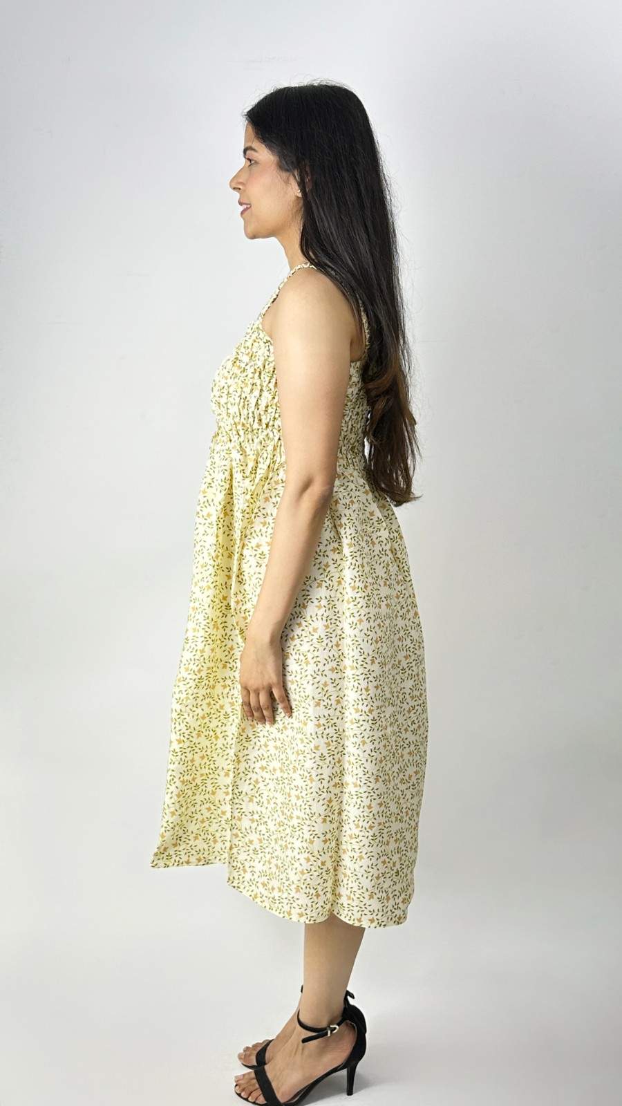 Rayon screen-printed cut-sleeves free-size gathers dress. It fits upto L size requirements. It has gathers for relaxation and style, well- suited for summers. Available in 3 more colours.