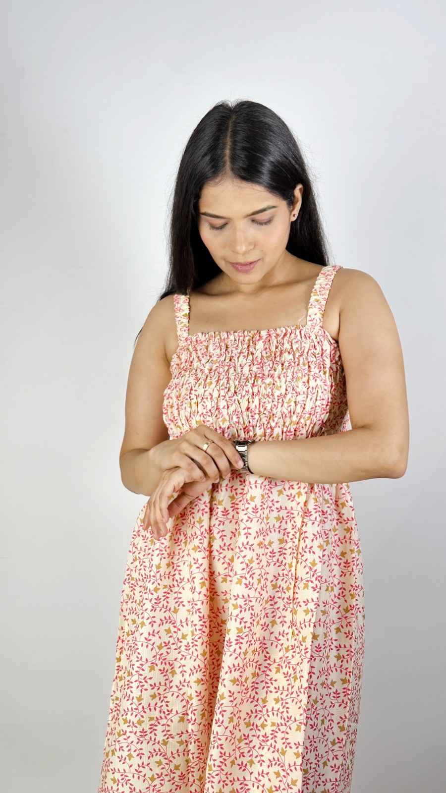 Rayon screen-printed cut-sleeves free-size gathers dress. It fits upto L size requirements. It has gathers for relaxation and style, well- suited for summers. Available in 3 more colours.