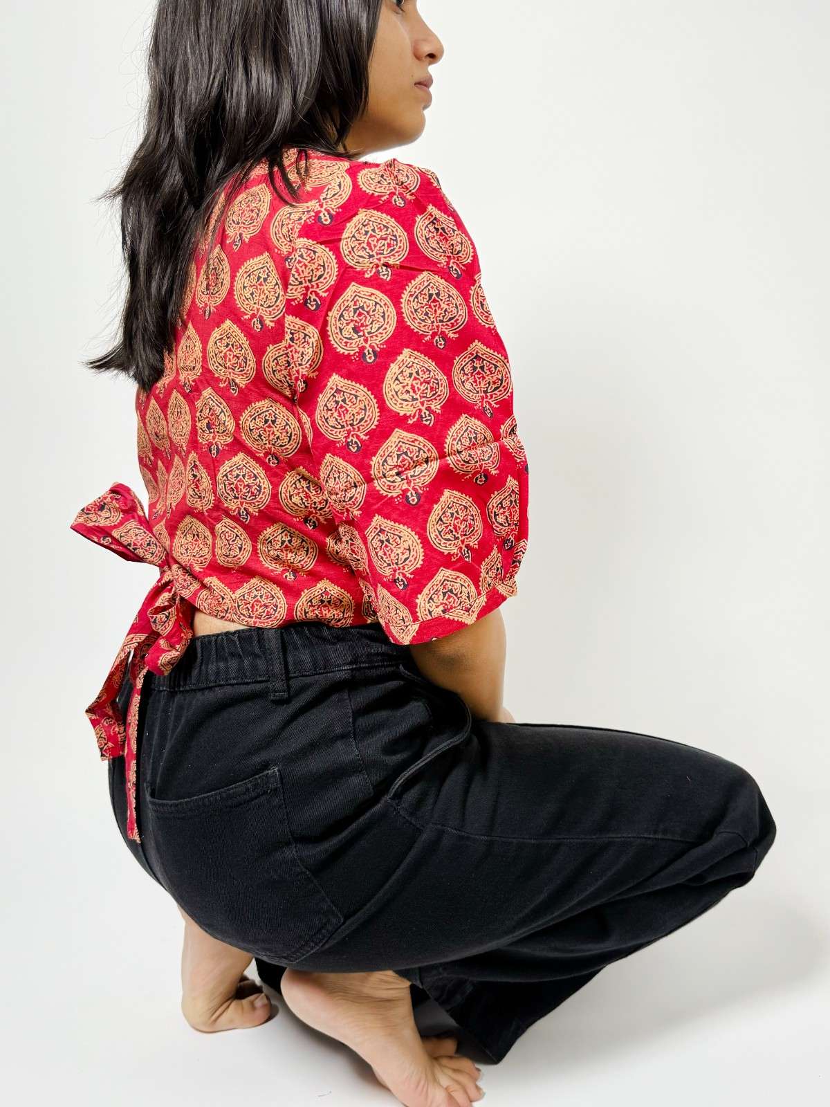 Block print wrap crop top. This is a free-size top that can fit XS-S-M-L sizes. It has half puffed sleeves. It can be tied on the back but can be tied in the front depending on your styling taste and purpose of wear.
