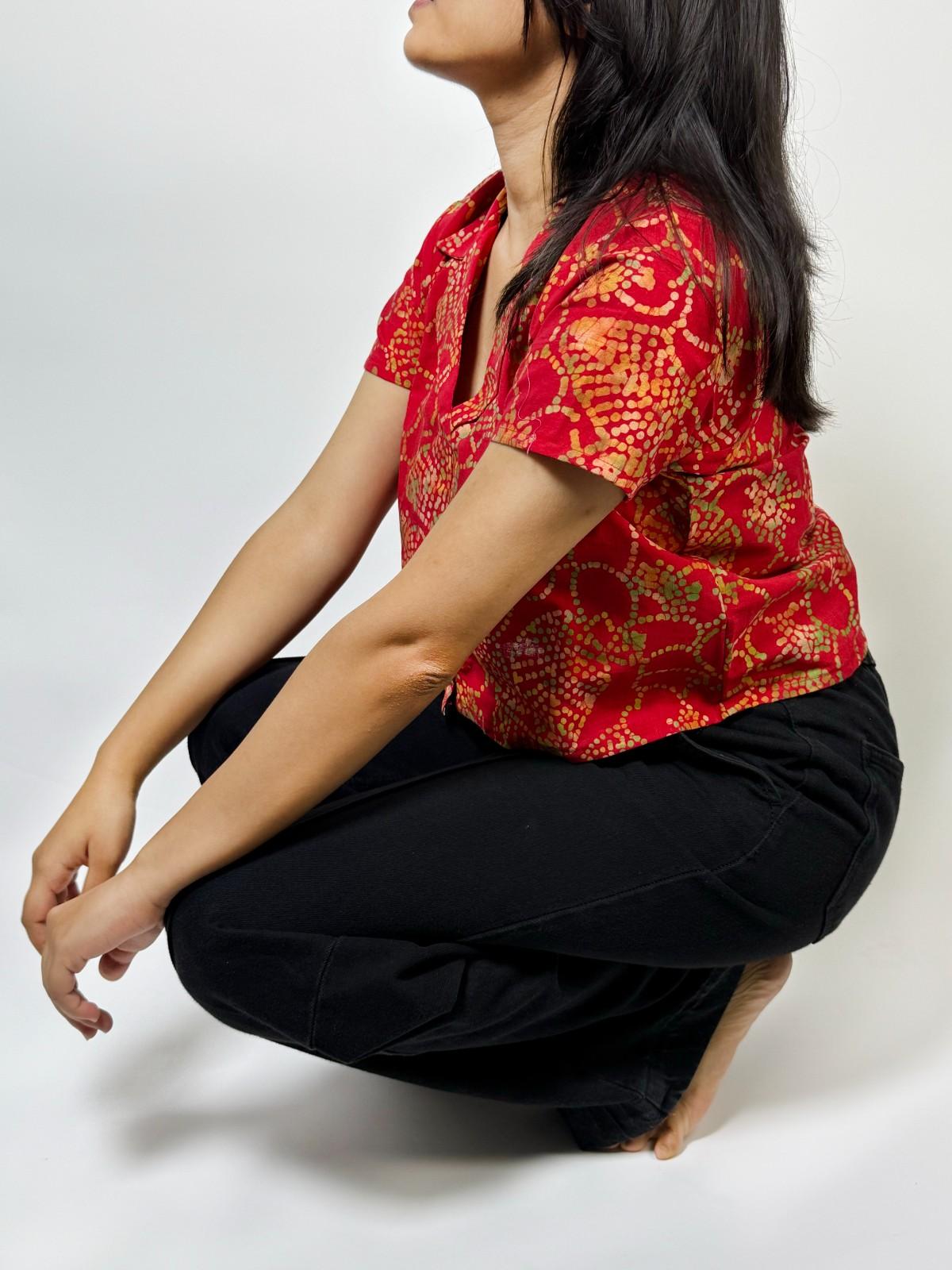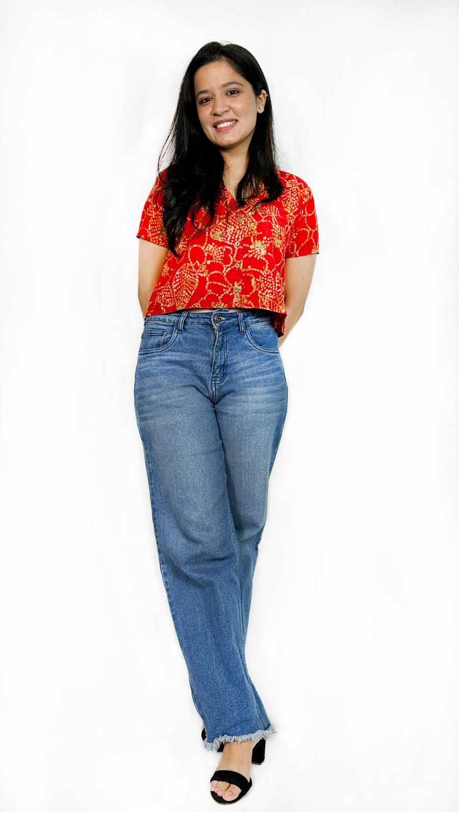 Digital printed semi-formal crop shirt with half sleeves and functional wooden buttons in the front. This has a notch collar.