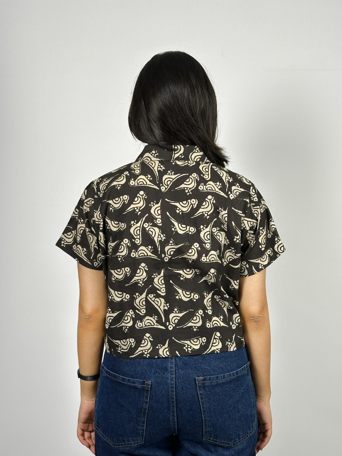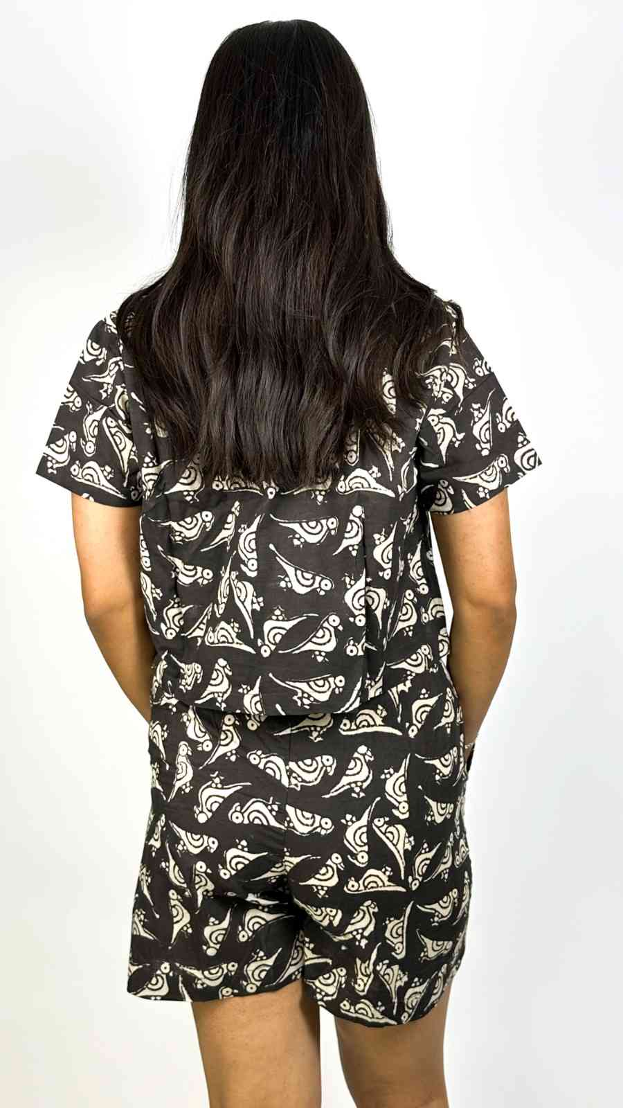 Three-piece co-ord set made using block printed fabric. It has a halter neck top, crop shirt and high waist shorts. Hand Block-Printed high waist shorts. It has elastic band on the back and a belt for better grip alongwith pockets on both sides. Hand Block-Printed halter neck top. It has to be tied from 2 sides- one behind the neck and second from the back. Block printed semi-formal crop shirt with half sleeves and functional wooden buttons in the front. A perfect summer bottoms. Made of pure cotton with finesse.