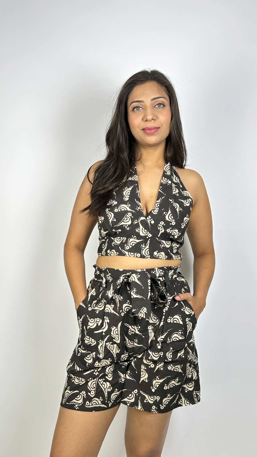 Two-piece co-ord set made using block printed fabric. It has a halter neck top and high waist shorts. Hand Block-Printed high waist shorts. It has elastic band on the back and a belt for better grip alongwith pockets on both sides. Hand Block-Printed halter neck top. It has to be tied from 2 sides- one behind the neck and second from the back. A perfect summer bottoms. Made of pure cotton with finesse.