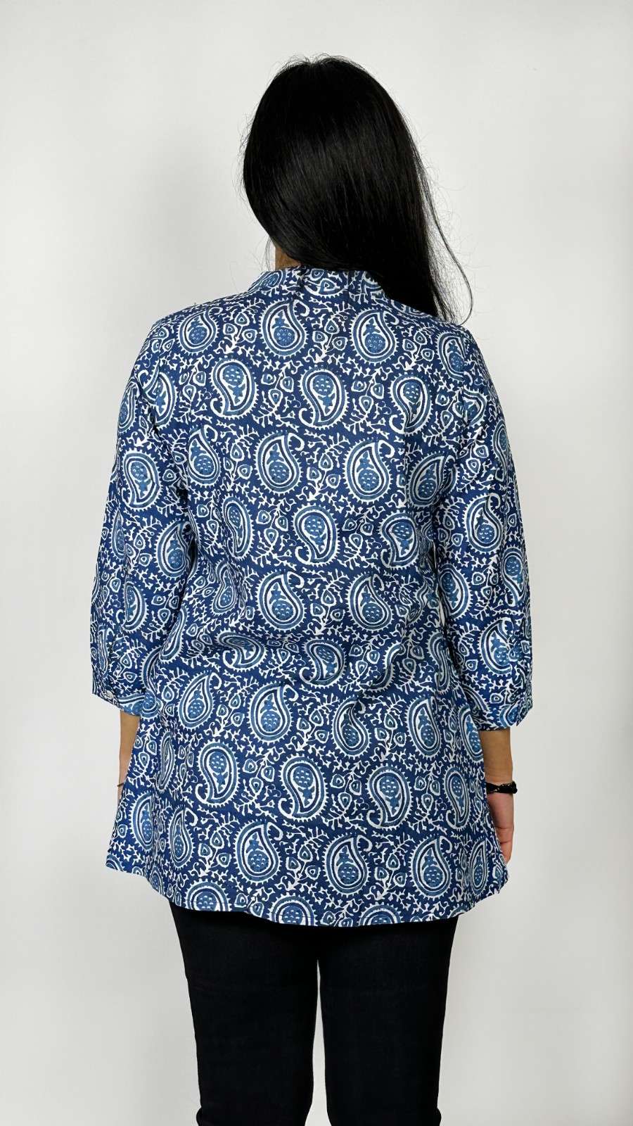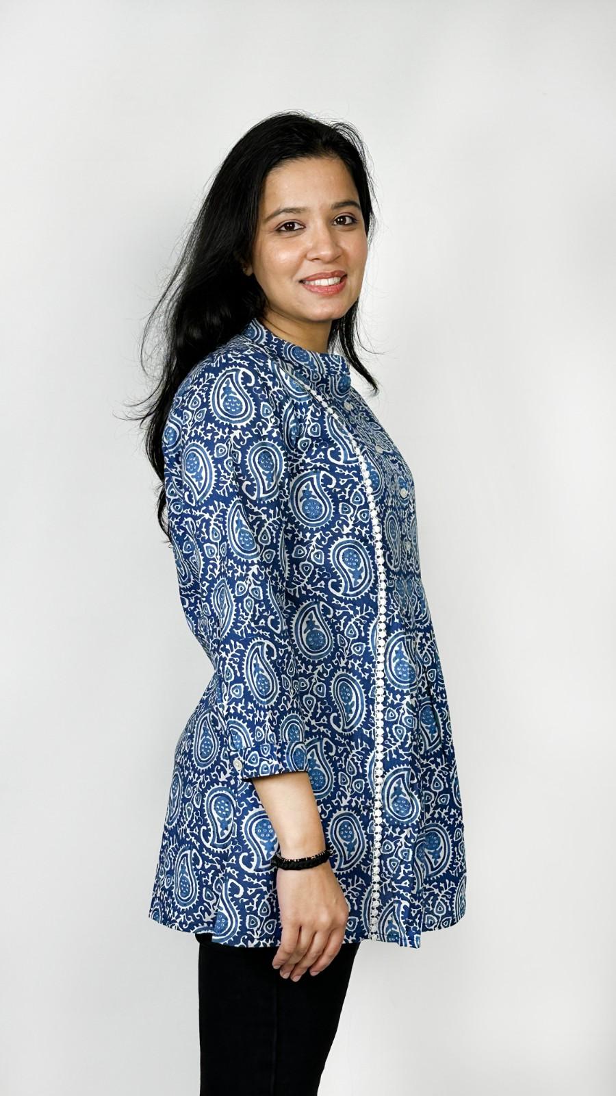 A screen-printed short cotton kurti emphasizing the princess line with lace detailing. Band collar with buttons for ease of wearing. Best suited for semi-formal occasions and colleges. Lightweight and breathable with a complete summer vibe and a few gathers in the front to add a feminine touch with 3/4th sleeves.