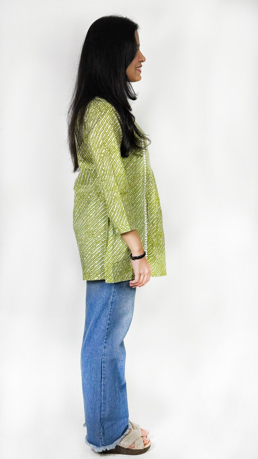 Lehariya printed short cotton kurti emphasizing princess line with lace detailing. Band collar with buttons for ease of wearing. Best suited for semi-formal occasions and colleges. Light weight and breathable with a complete summer vibe and a few gathers in the front to add a feminine touch with 3/4th sleeves.