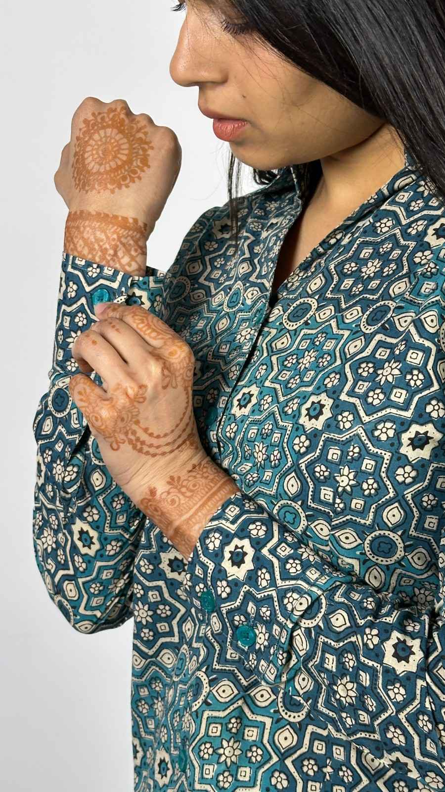 Block print formal shirt with full sleeves and cuffs. Well suited for formal events in summers.