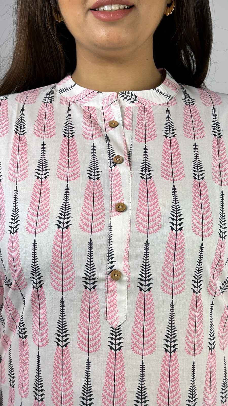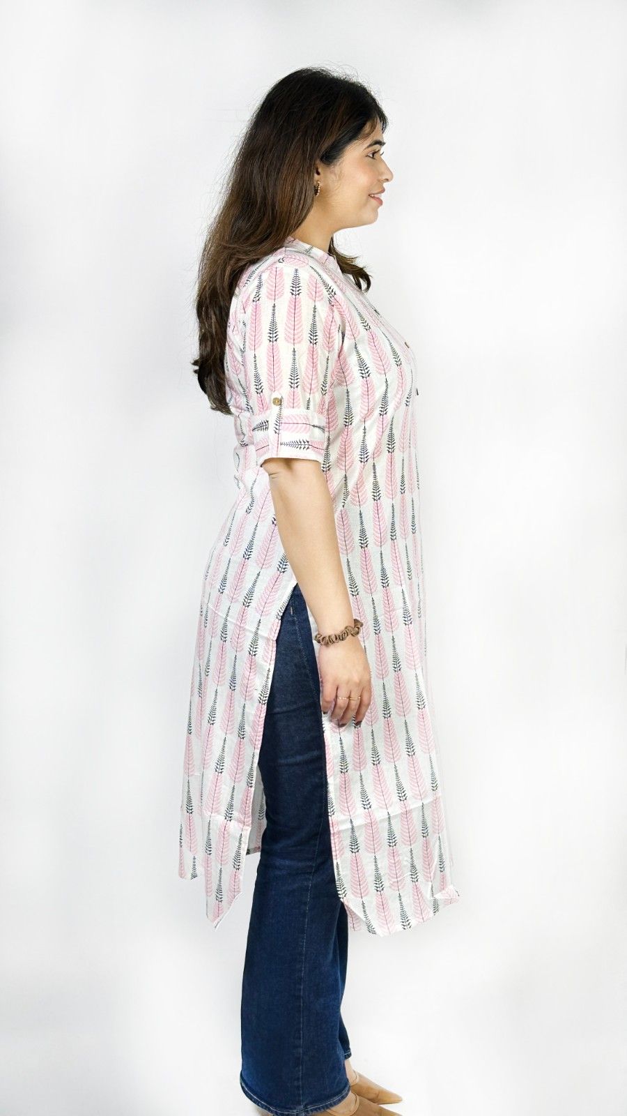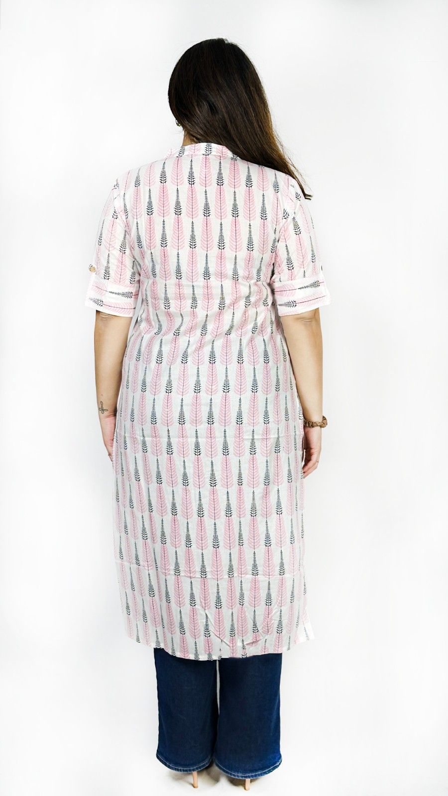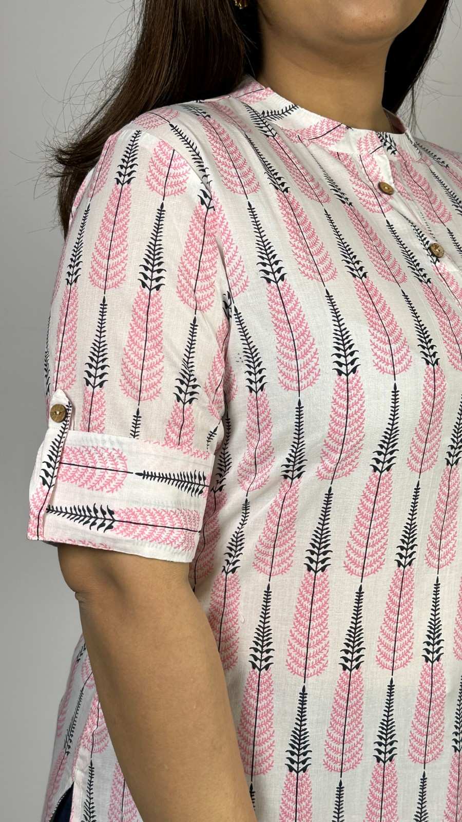 Cotton kurti with band collar and cuffs. It has half-folded sleeves and round band neck. Breathable and well-suited for summers.