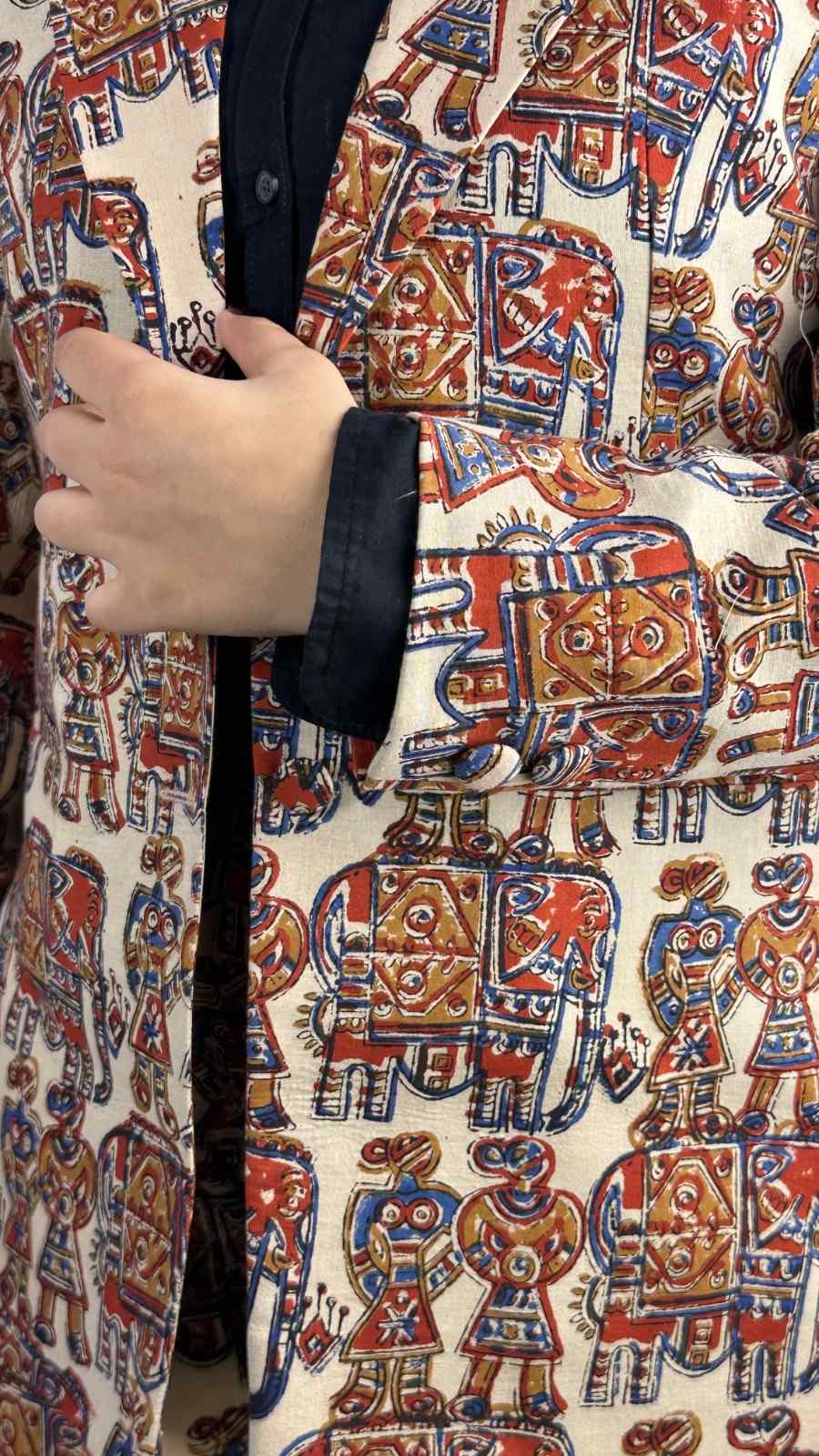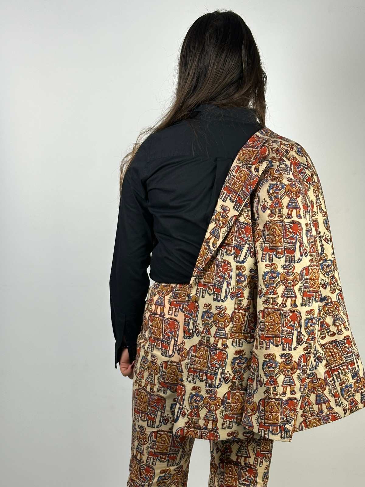 Hand Block Printed Coat-Pant suit is an exclusive Aurasya attire curated to cater to your formal events' requirements with a pinch of Indian touch. This is a 2 piece set with a bell-bottom pants with pockets and a peak lapel coat with pockets. This coat has shoulder pads.