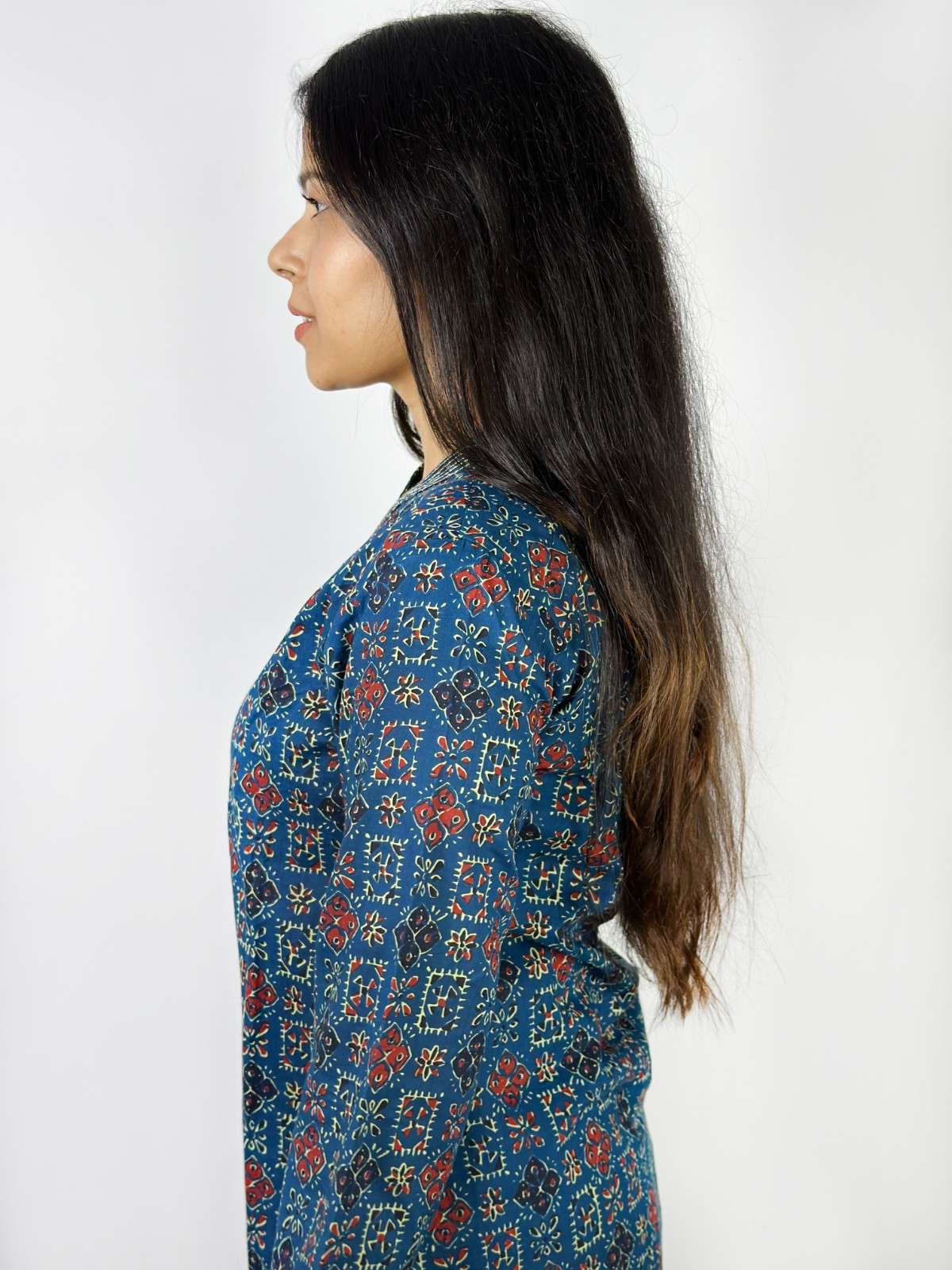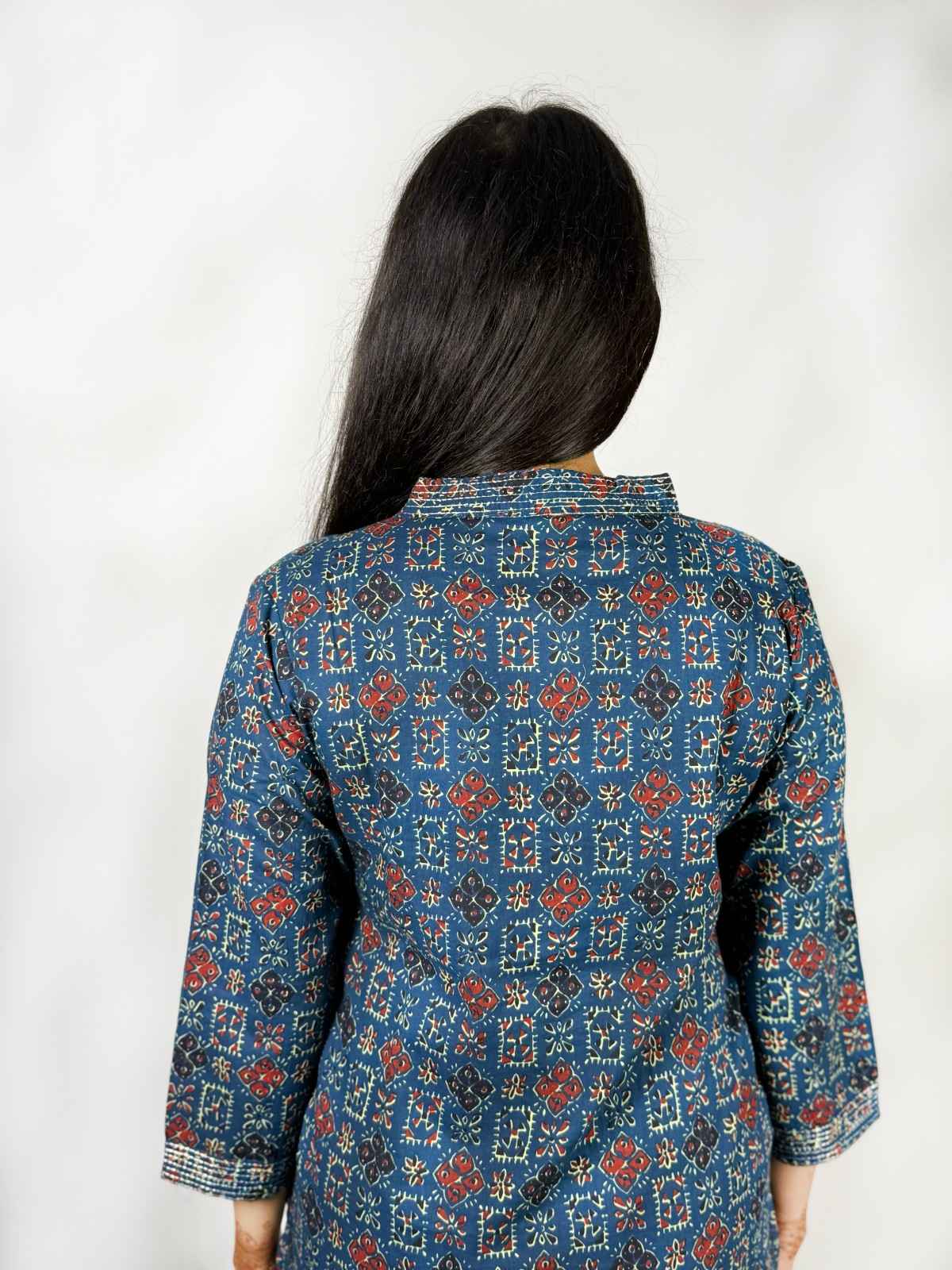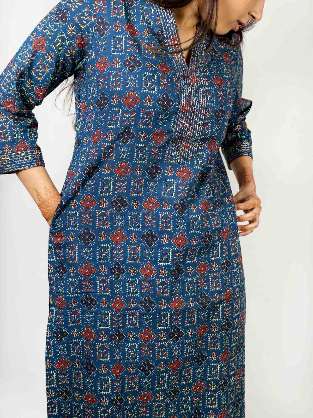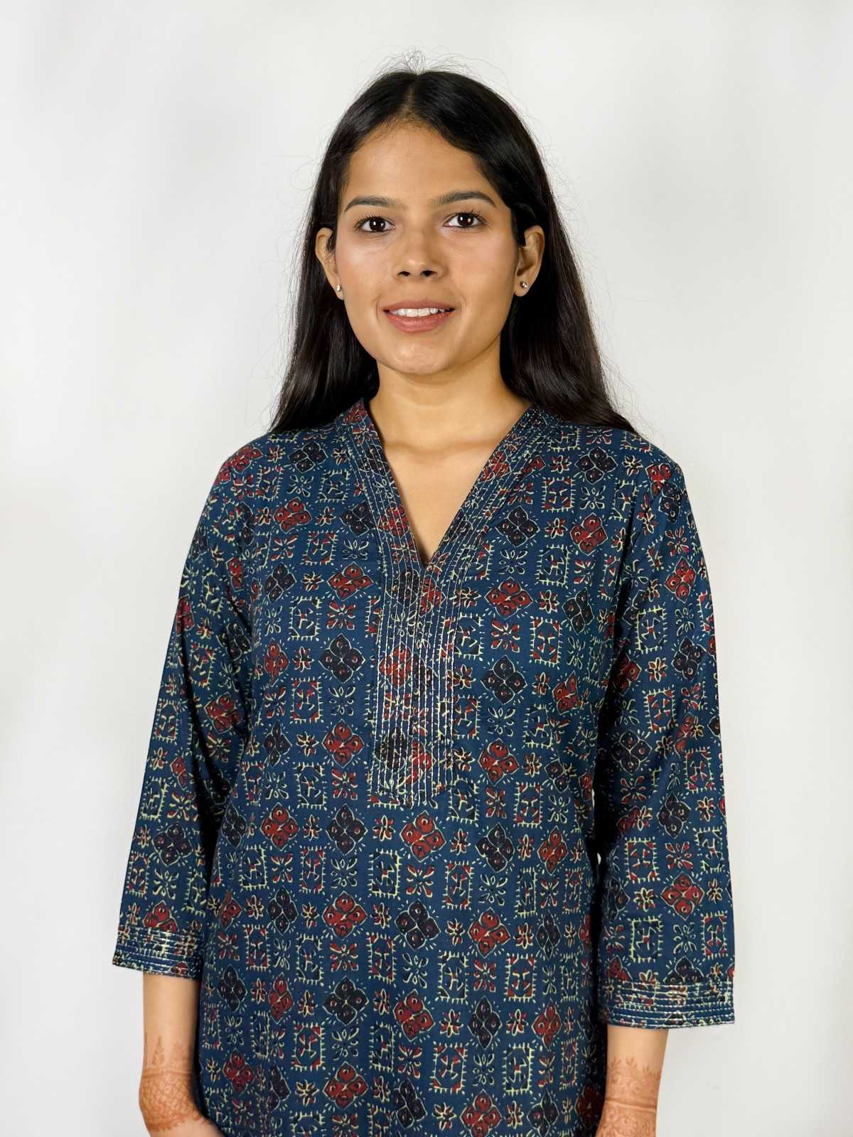 Cotton kurti with thread detailing on collar and cuffs. It has 3/4th sleeves and V-shaped neck cut. Breathable and well-suited for summers.