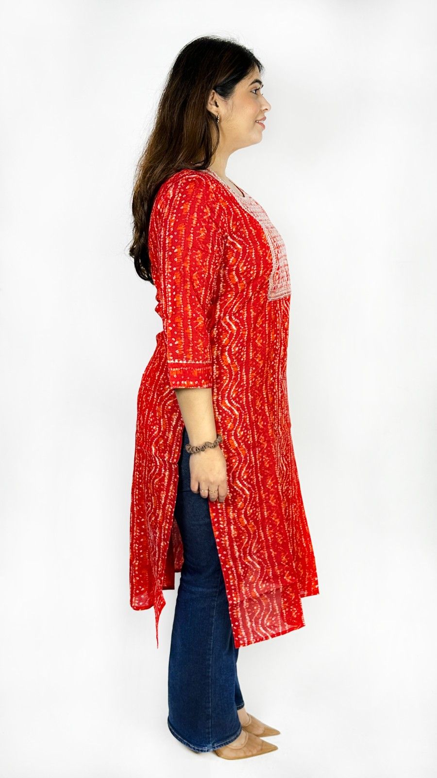 Cotton printed kurti with embellishment on the front for detailing. Breathable and well-suited for summers. It has 3/4th sleeves and round neck cut.