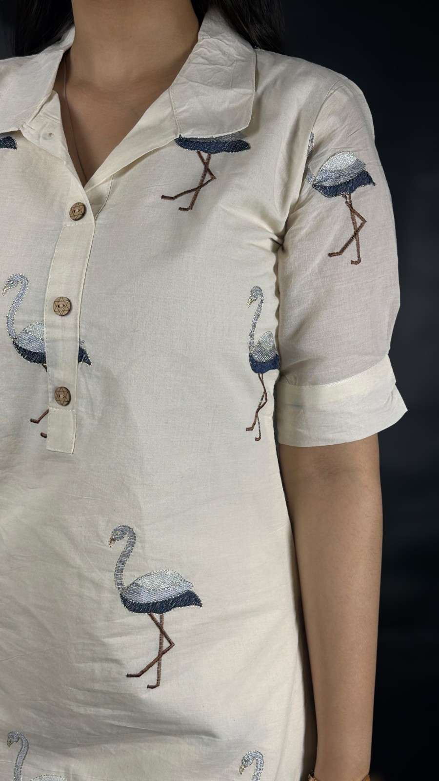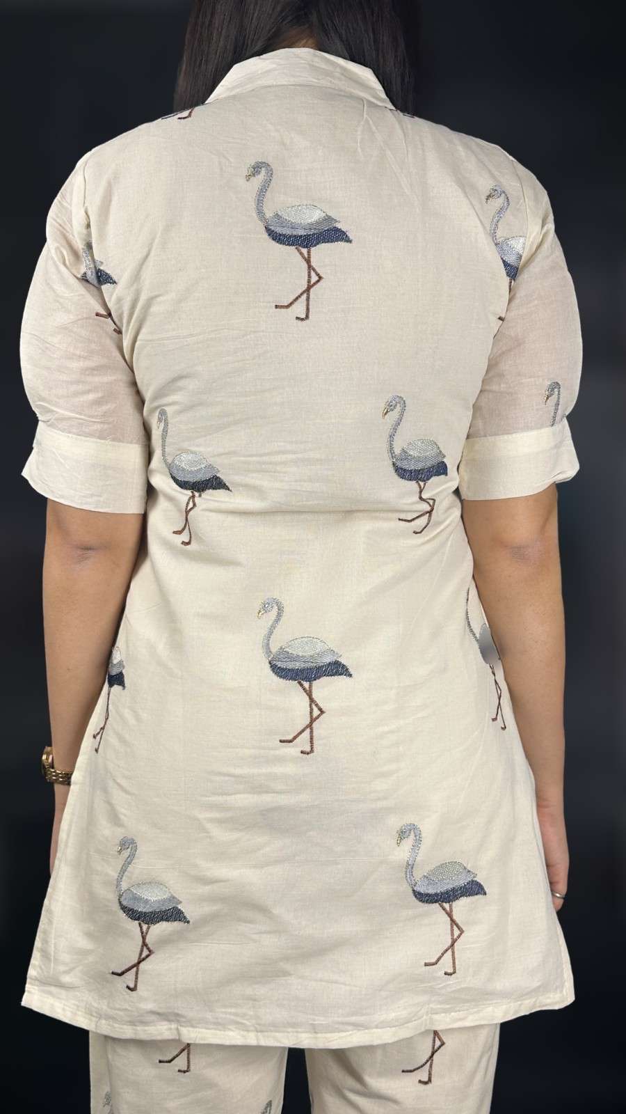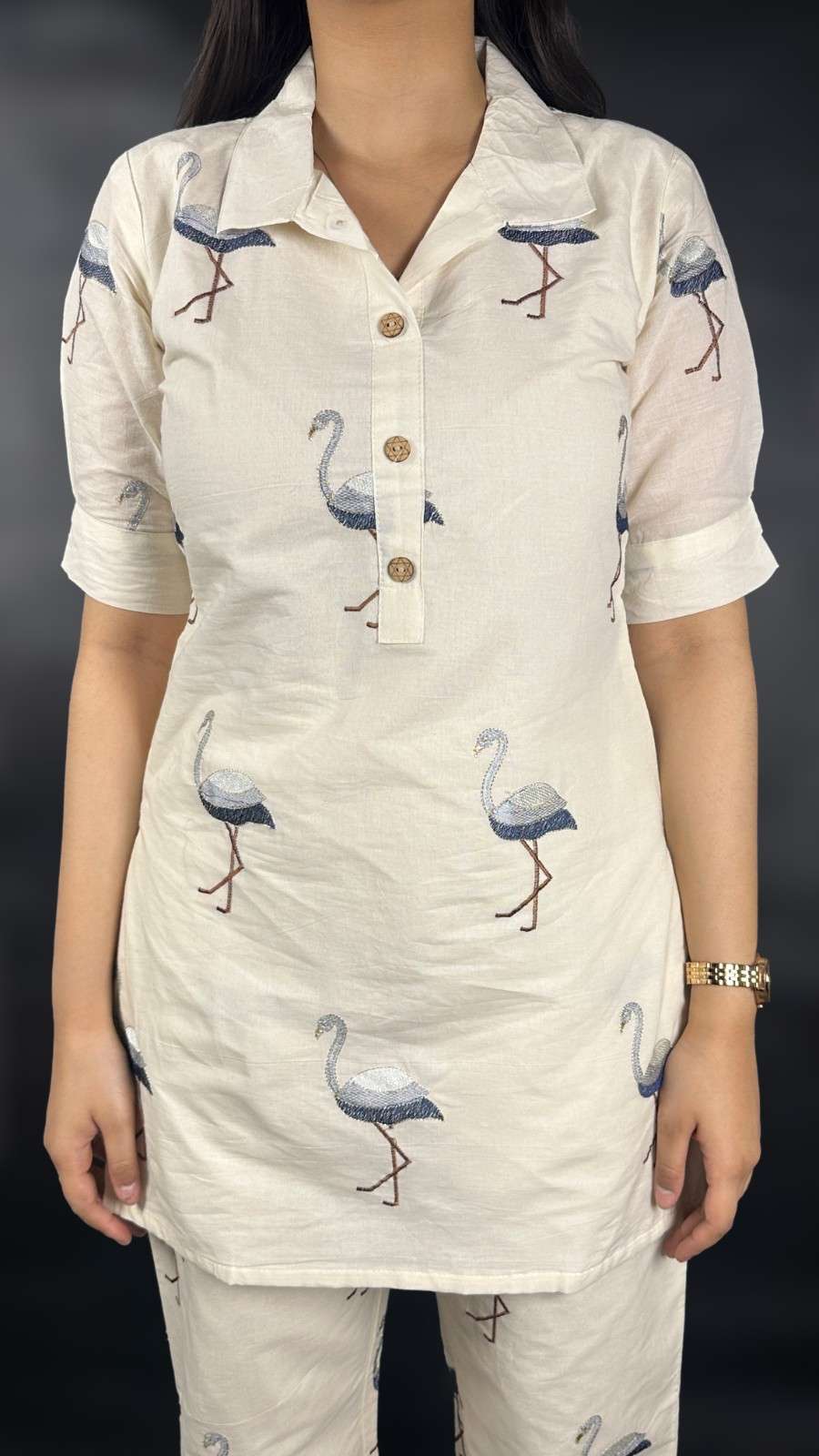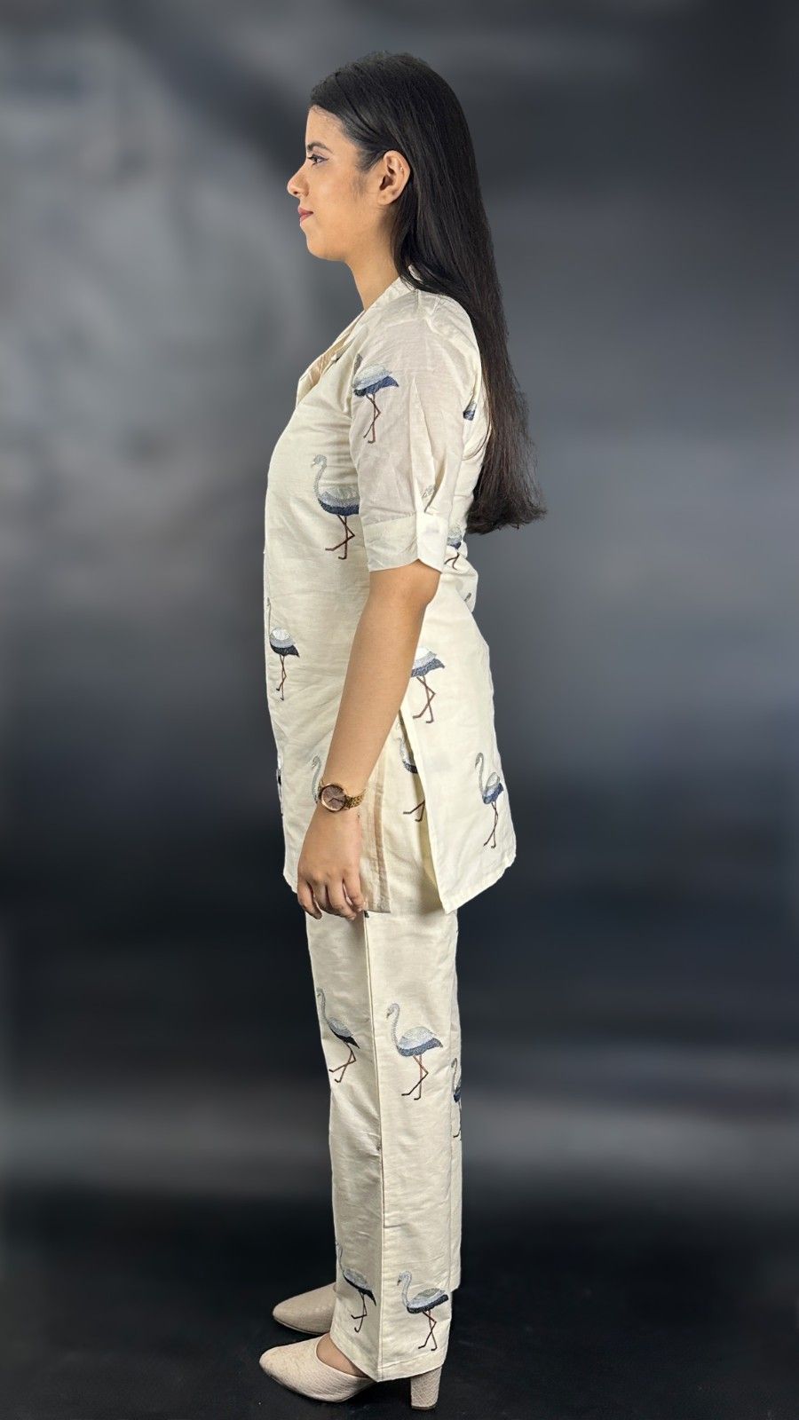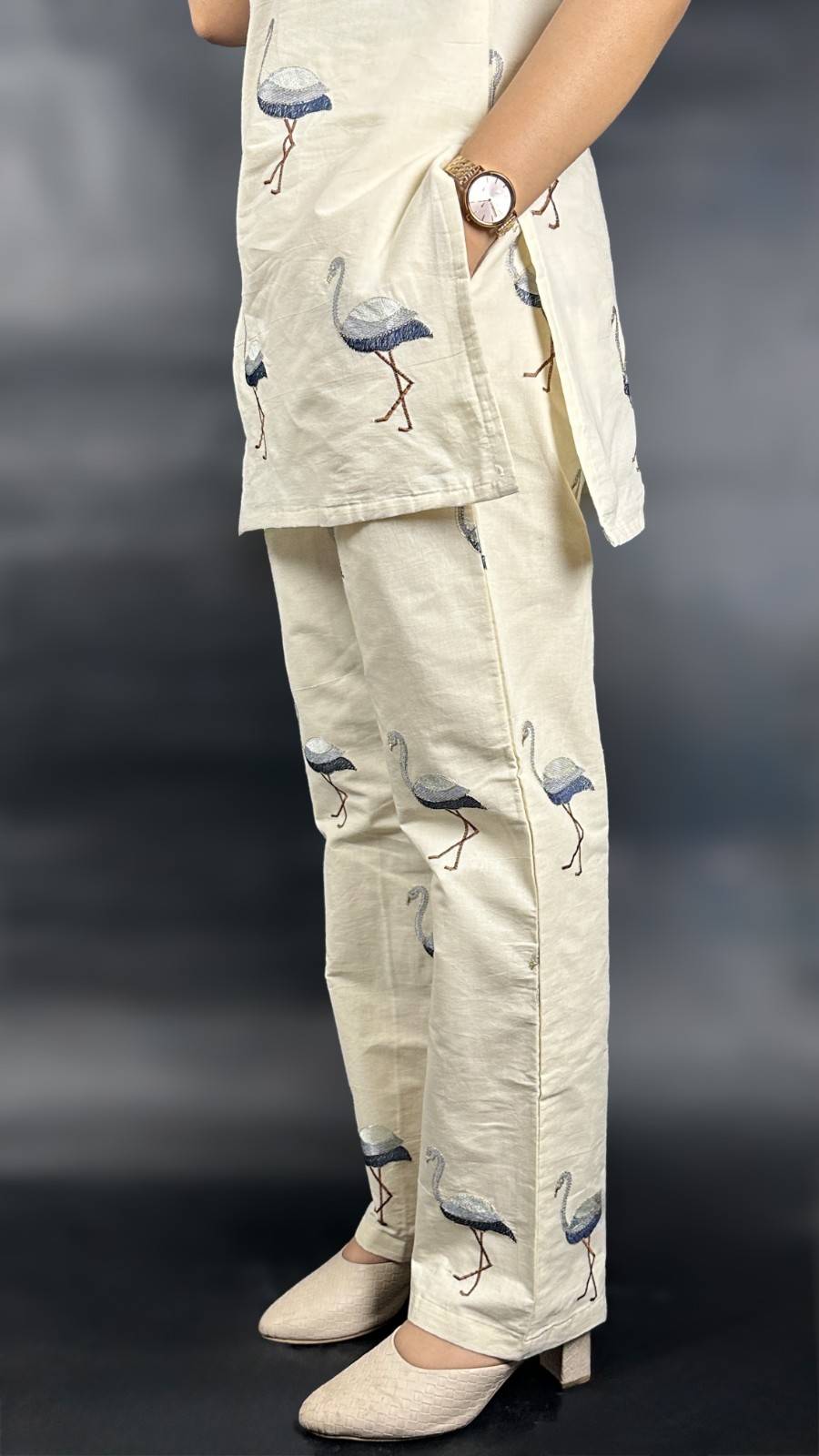 9586 Khadi Cotton Co-ord Set has a soft lining of cotton. The top has collar style, 1/2 sleeves and 3 botton placket down the collar. The Bottom has a pocket on each sides and has an elastic band on the back of the waist band for ease of fit. The entire outfit has machine embroidered swans stitched on it. It is suitable for travel and casual occasions in summer season.