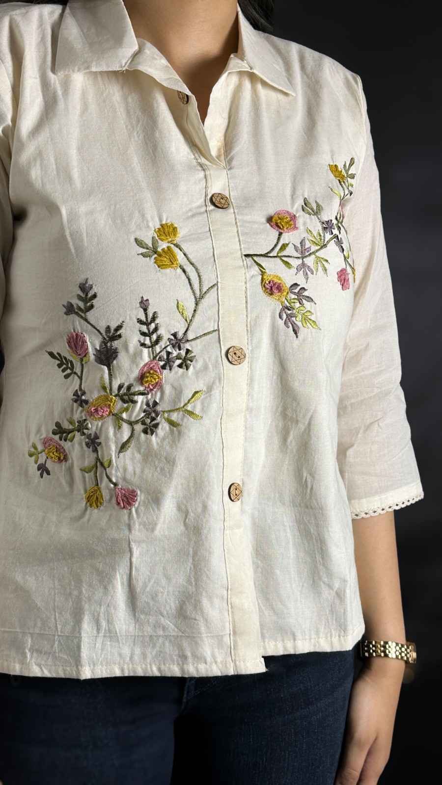 9586 Khadi Cotton Top has a soft lining of cotton. Comes with 3/4th sleeves and hand embroidered floral designs on it. It looks like a formal shirt, thus is suitable for formal events and for summers.