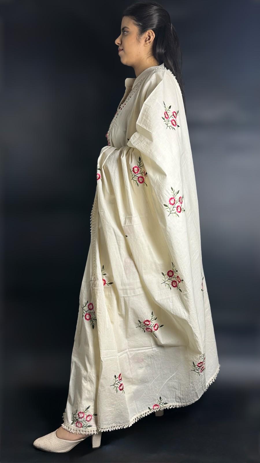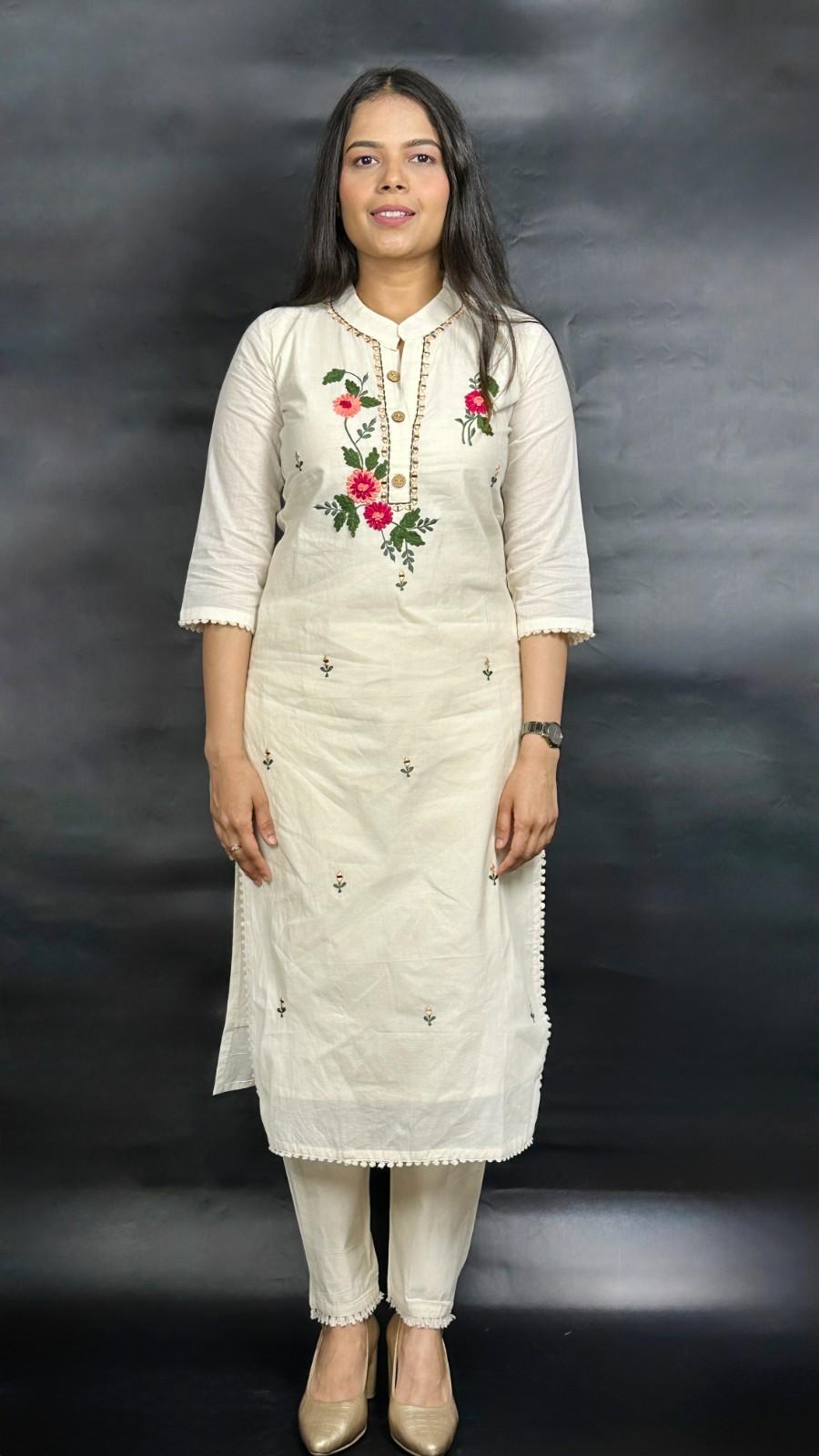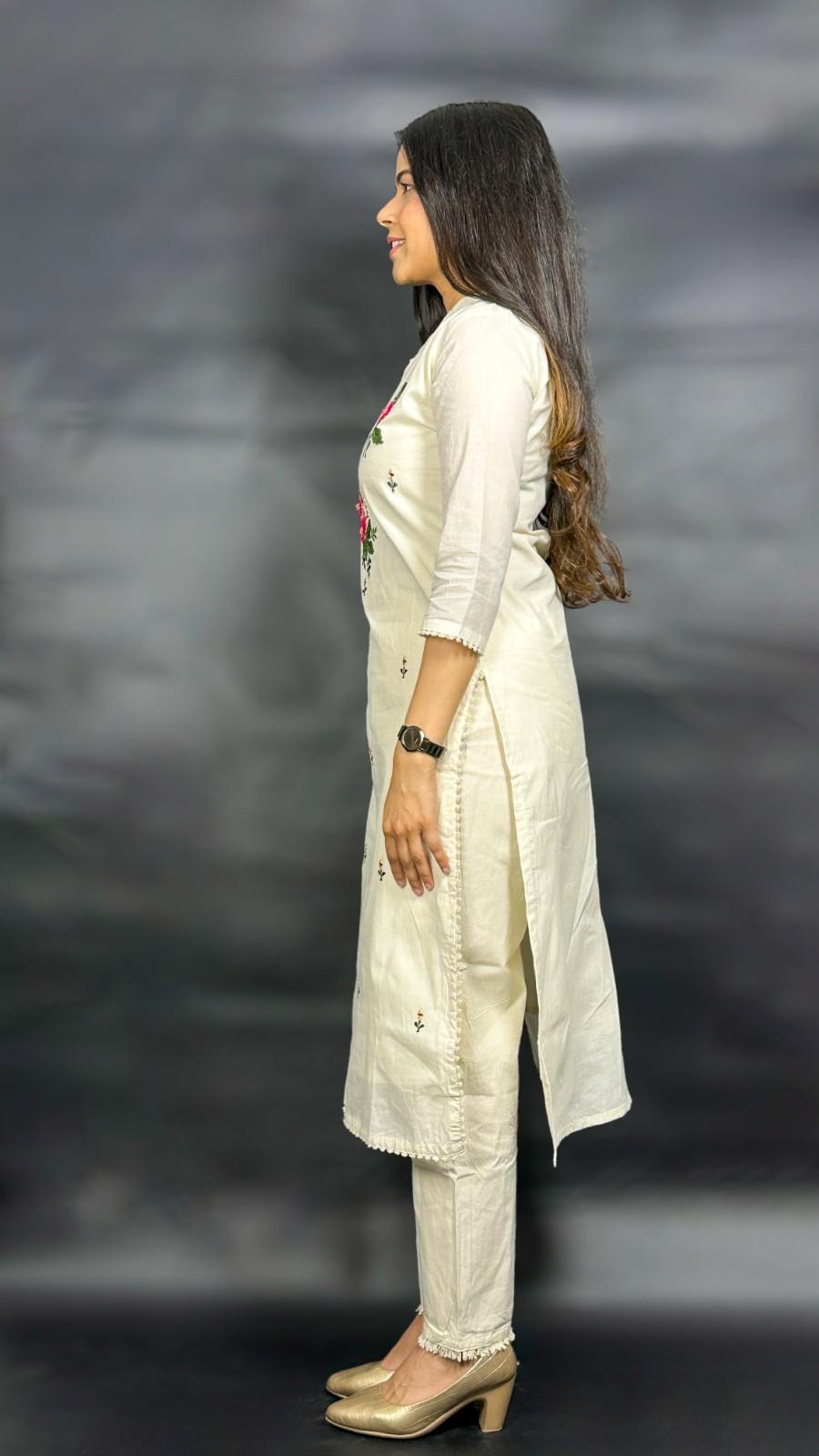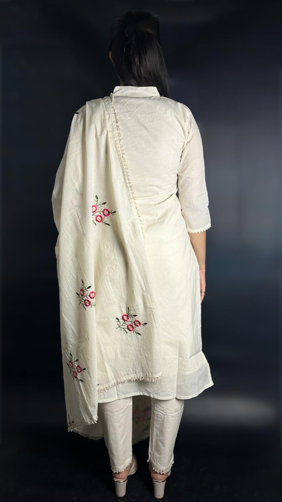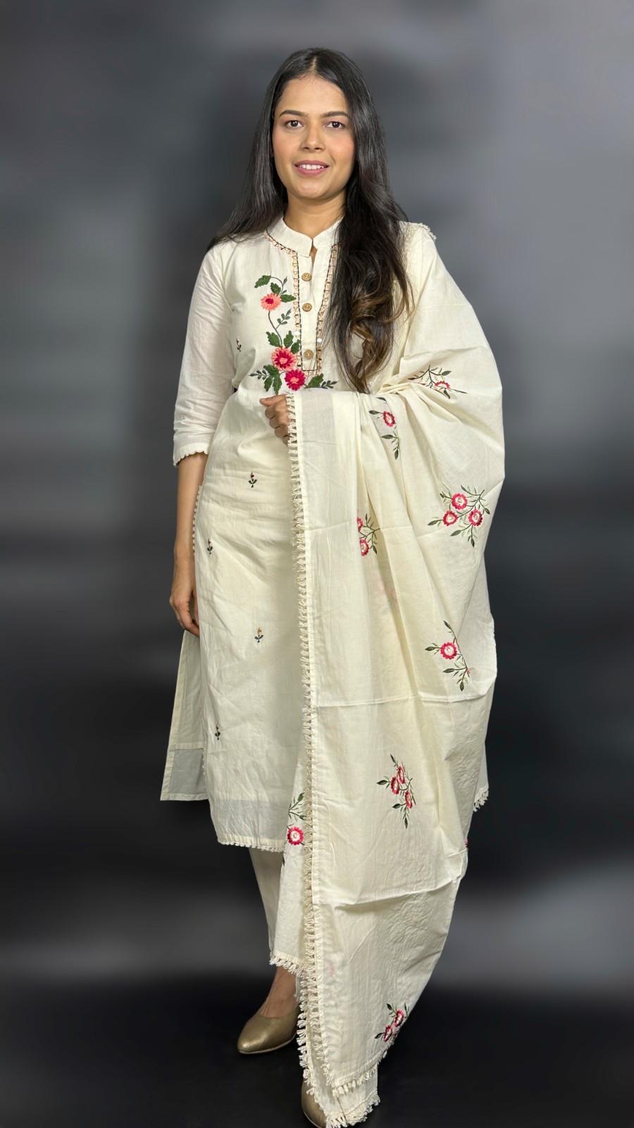 9586 Khadi Cotton Three-piece Suit has a soft lining of cotton. The Kurti has Nehru collar style, 1/3rd sleeves and 3 botton placket down the collar. The Bottom has a pocket and has an elastic band on the back of the waist band for ease of fit. The Kurti has hand embroidred floral designs on it alongwith mirror work and the dupatta has similar design embroidered on it with machine. It is suitable for festive occasions in summer season.