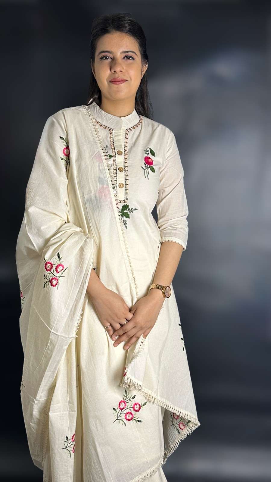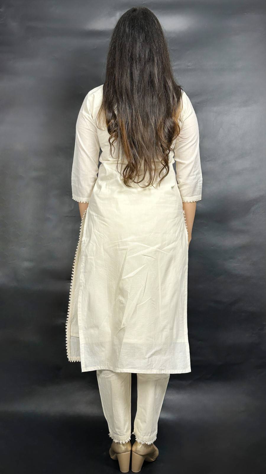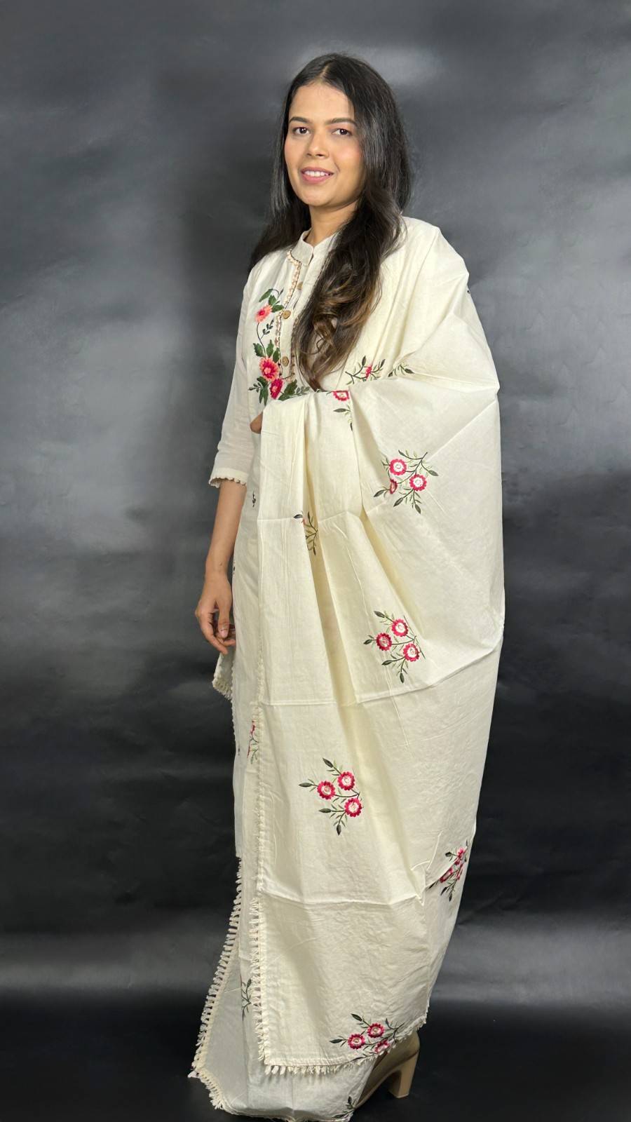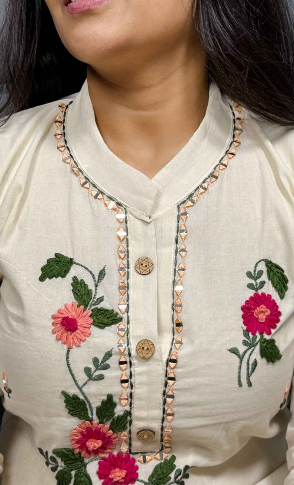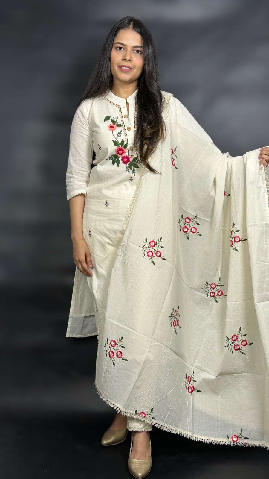 9586 Khadi Cotton Three-piece Suit has a soft lining of cotton. The Kurti has Nehru collar style, 1/3rd sleeves and 3 botton placket down the collar. The Bottom has a pocket and has an elastic band on the back of the waist band for ease of fit. The Kurti has hand embroidred floral designs on it alongwith mirror work and the dupatta has similar design embroidered on it with machine. It is suitable for festive occasions in summer season.