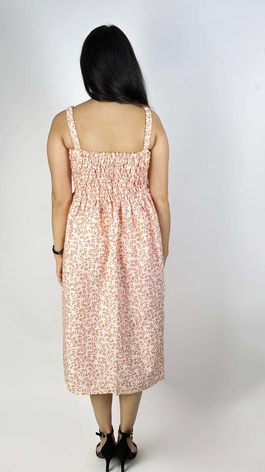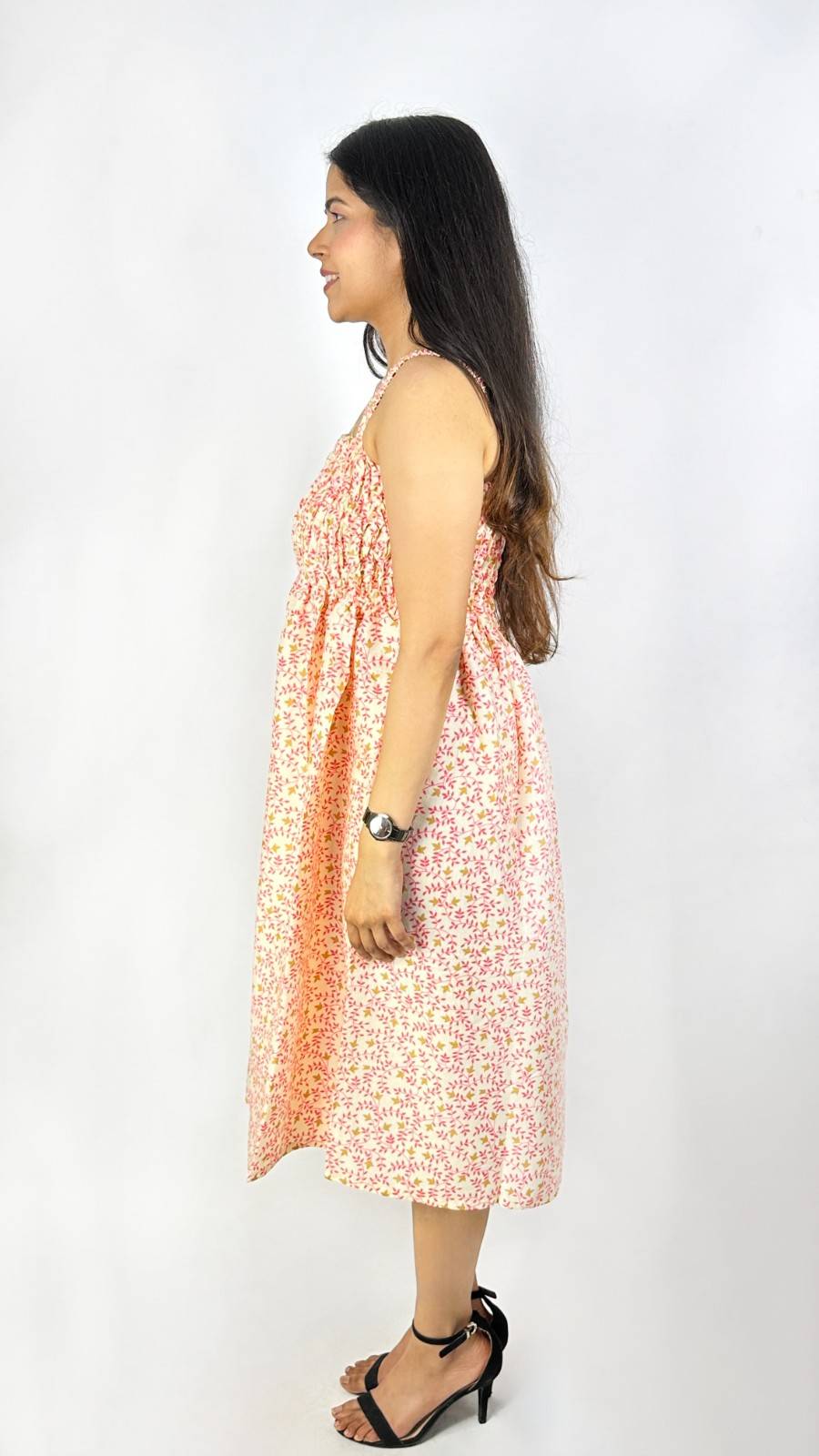 Rayon screen-printed cut-sleeves free-size gathers dress. It fits upto L size requirements. It has gathers for relaxation and style, well- suited for summers. Available in 3 more colours.