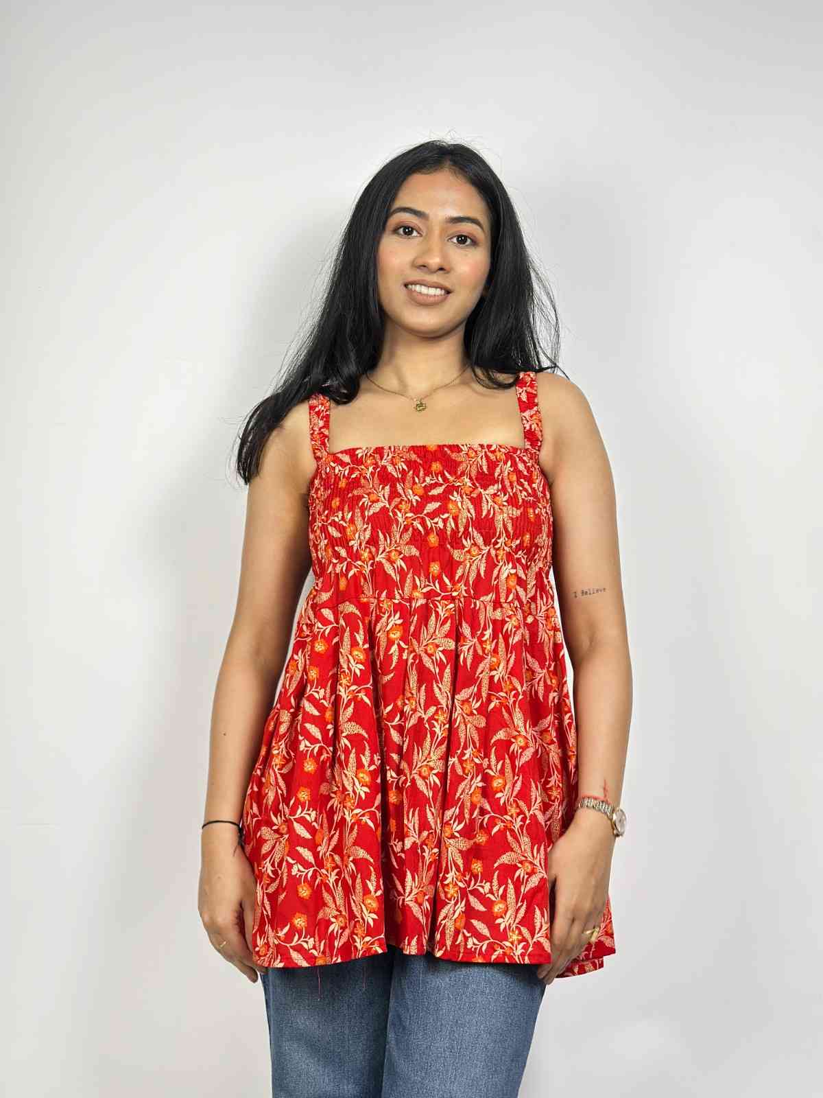 Cotton screen-printed cut-sleeves free-size peplum top. It fits upto L size requirements. It has gathers for relaxation and style. Available in 3 more other colours.