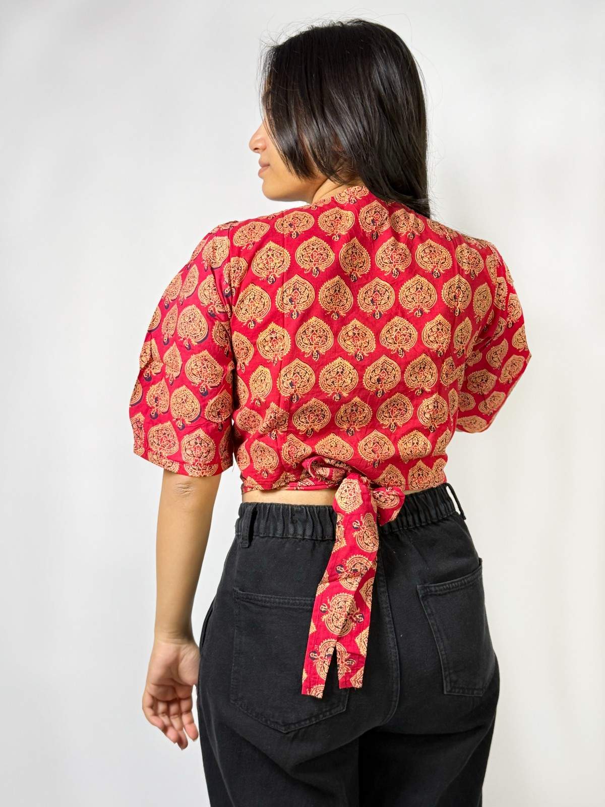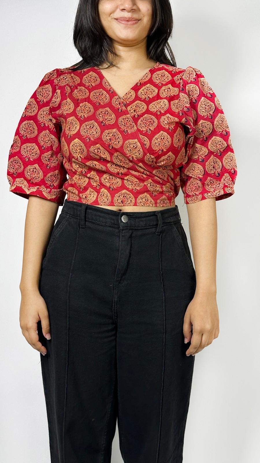 Block print wrap crop top. This is a free-size top that can fit XS-S-M-L sizes. It has half puffed sleeves. It can be tied on the back but can be tied in the front depending on your styling taste and purpose of wear.