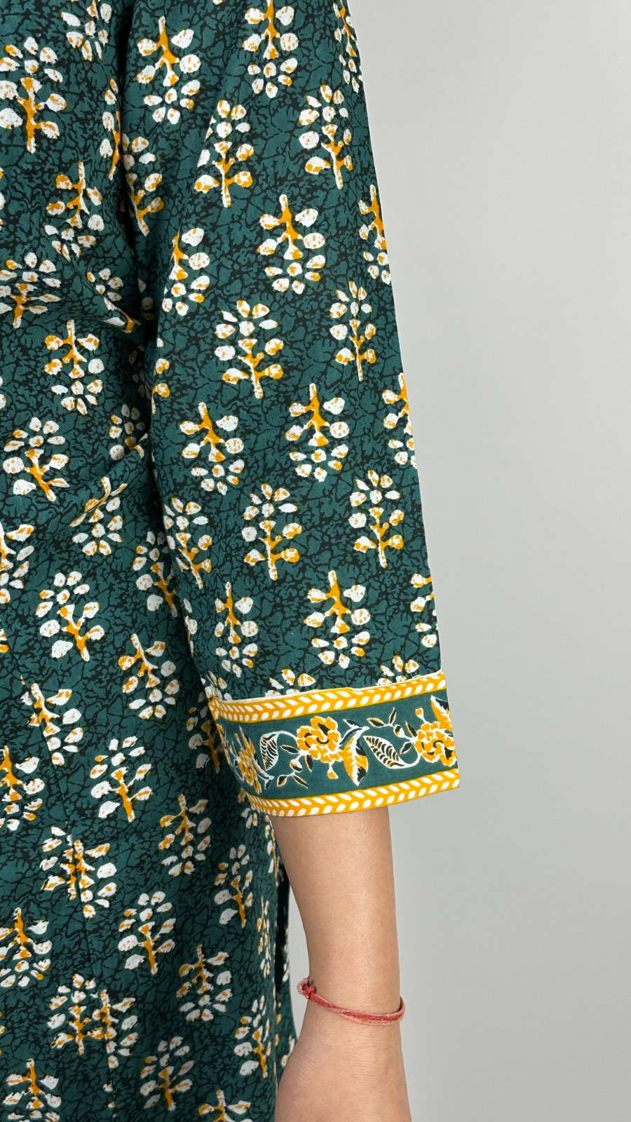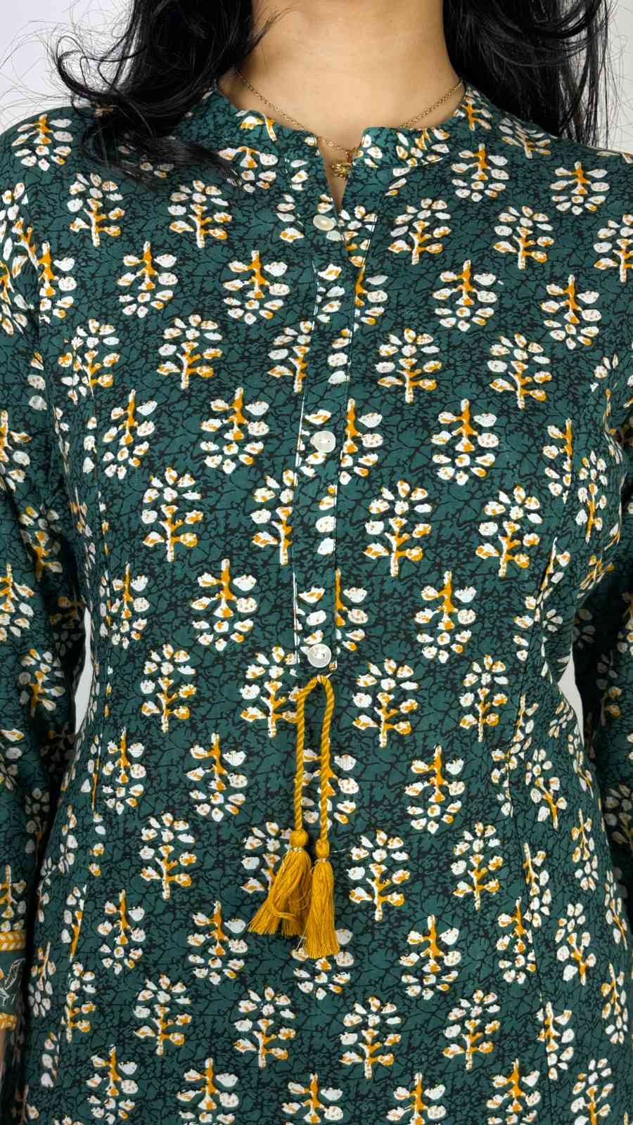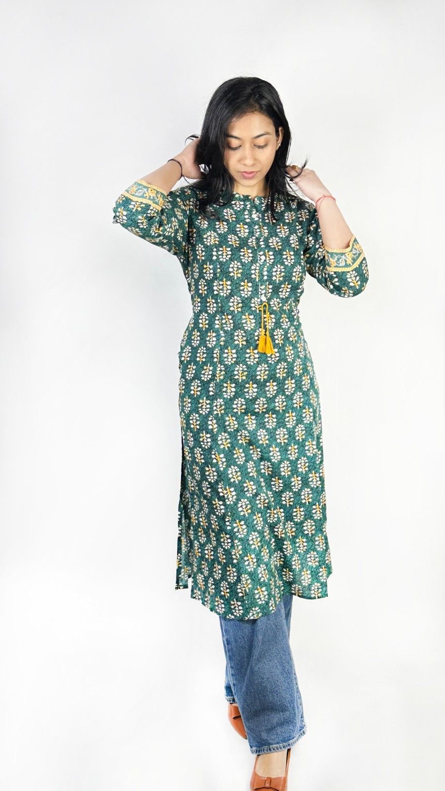 Green cotton kurti with a tassel and printed details on the cuffs. It has 3/4th sleeves and a band collar. Breathable and well-suited for summers.