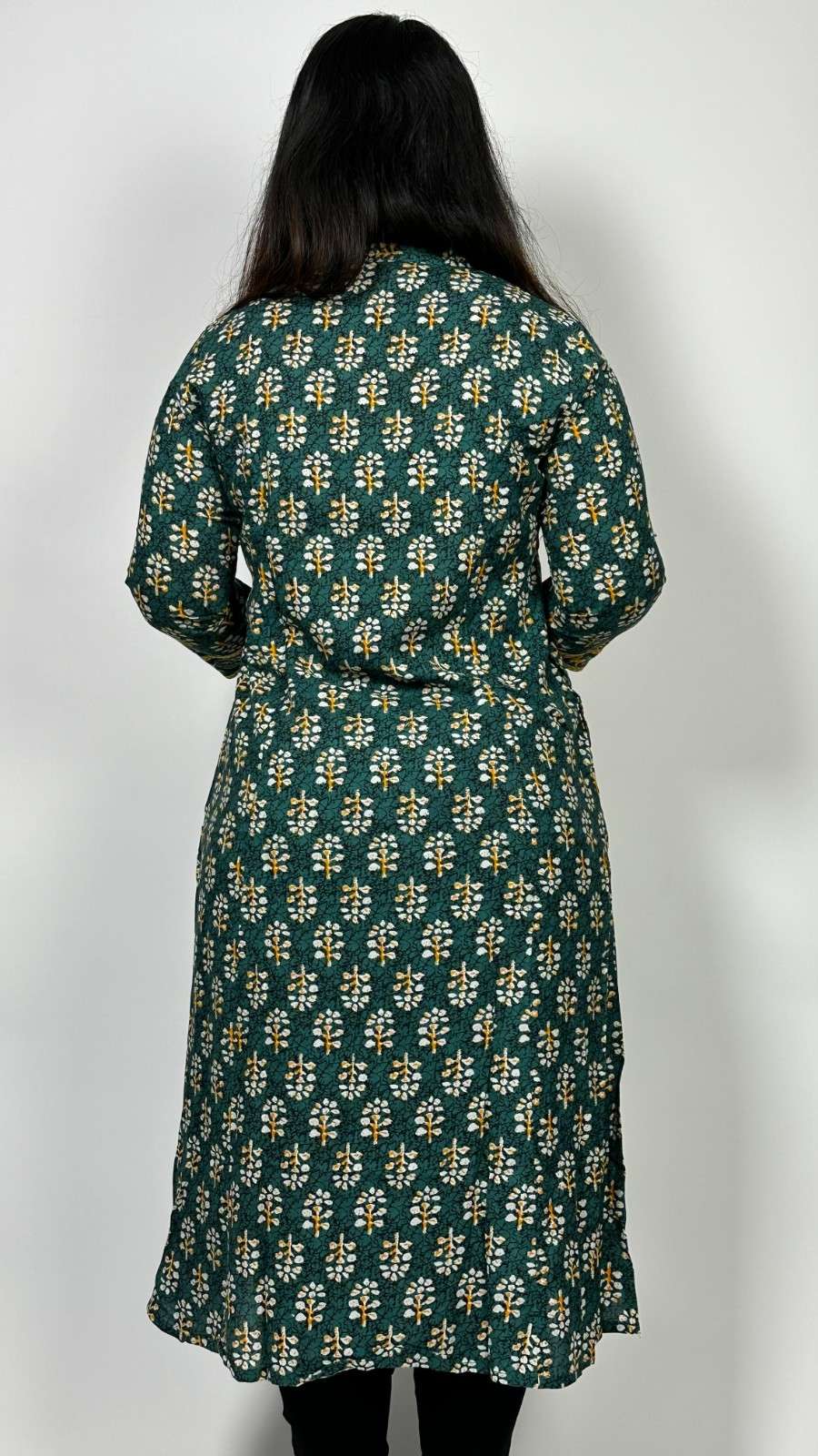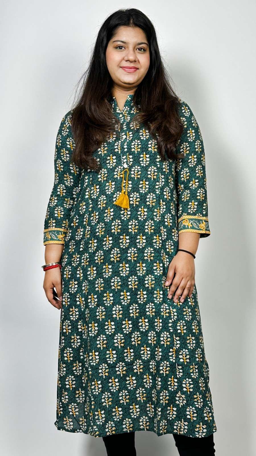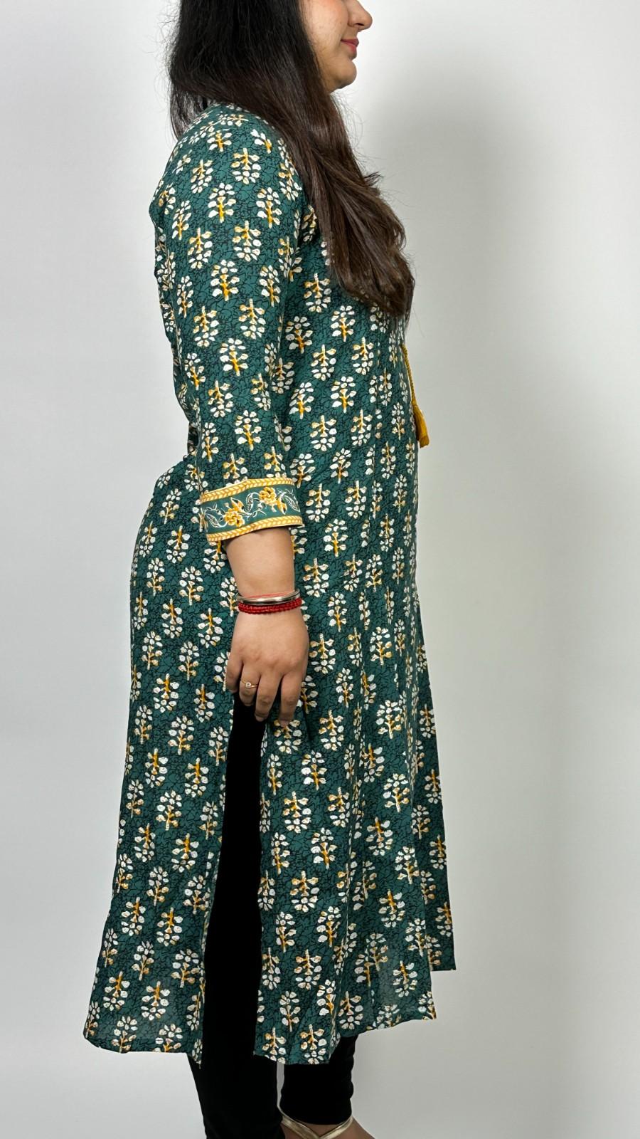 Green cotton kurti with a tassel and printed details on the cuffs. It has 3/4th sleeves and a band collar. Breathable and well-suited for summers.