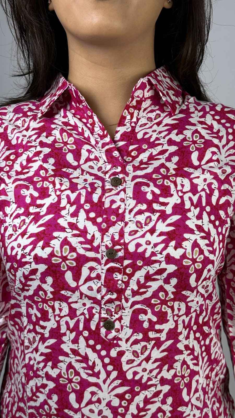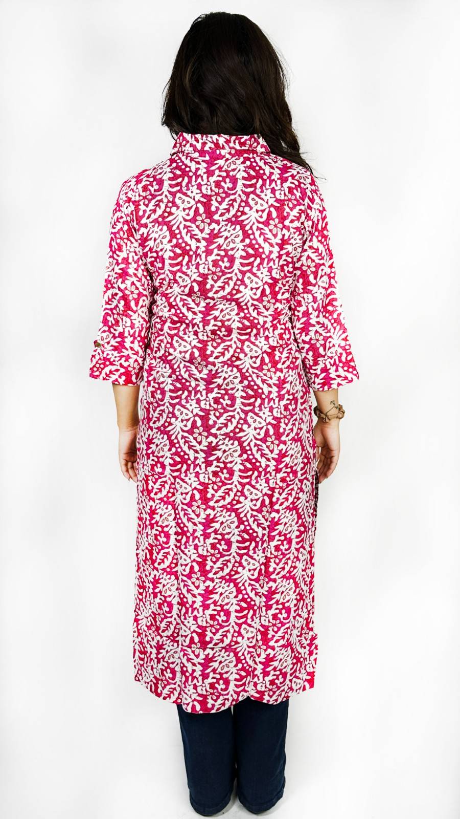 Cotton kurti with collar and cuffs. It has half folded sleeves and collar. Breathable and well-suited for summers.