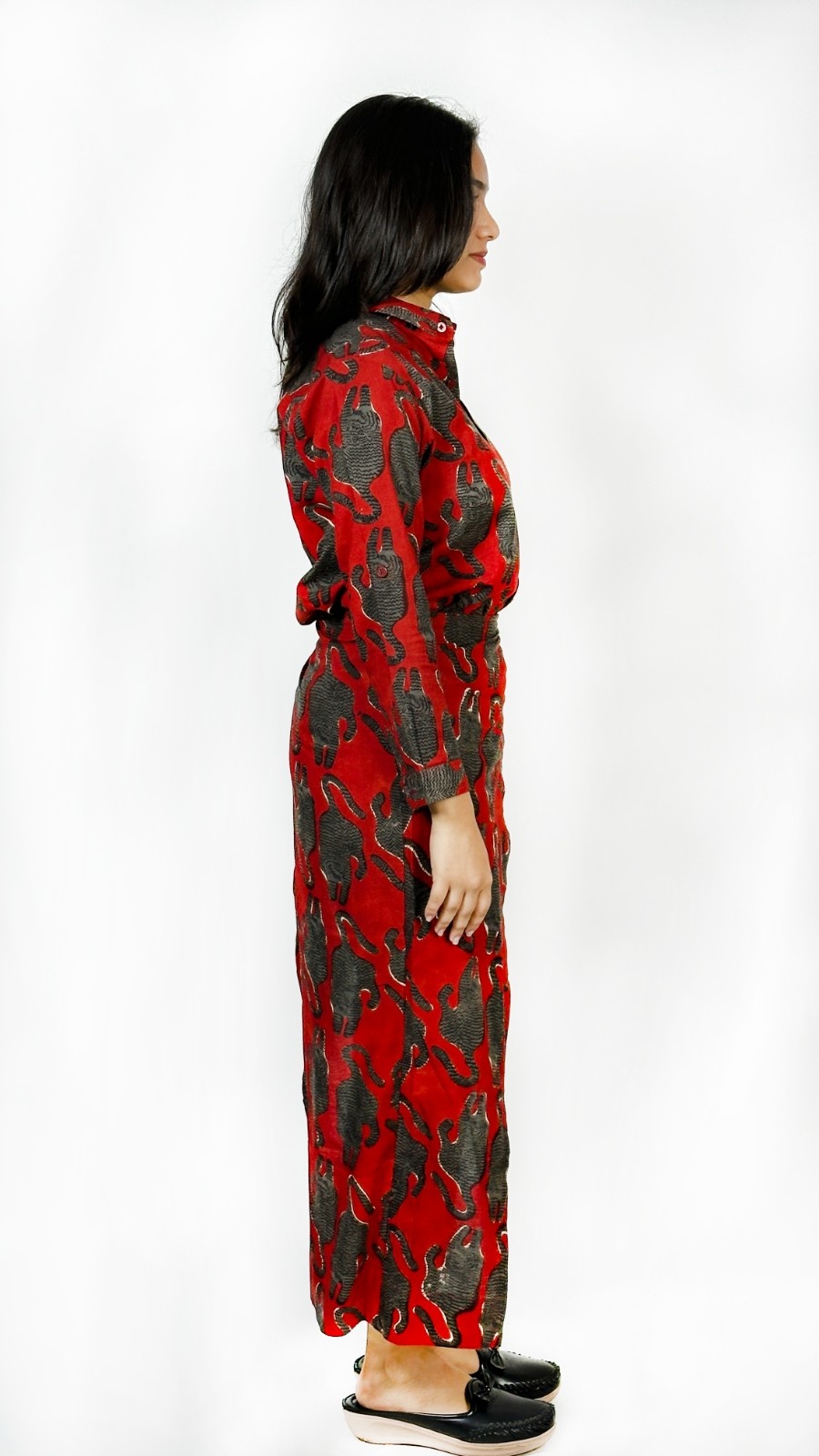 Block print co-ord set with a formal shirt and wrap straight pants. Has a zipper and a hook on the left side on the pants. Shirt with 3/4th sleeves. Well suited for formal events in summers.
