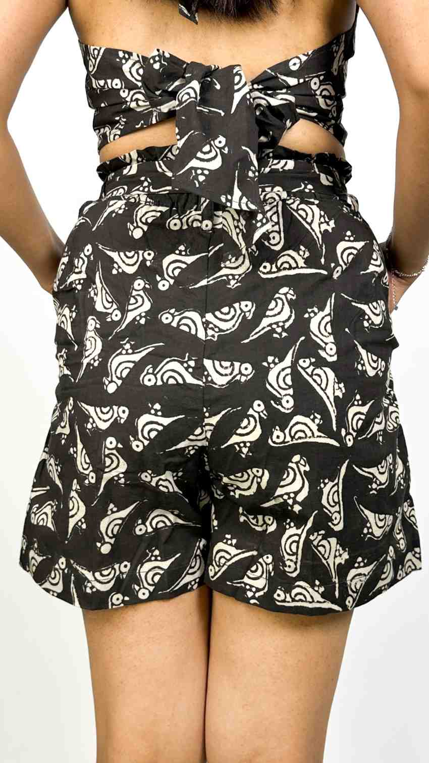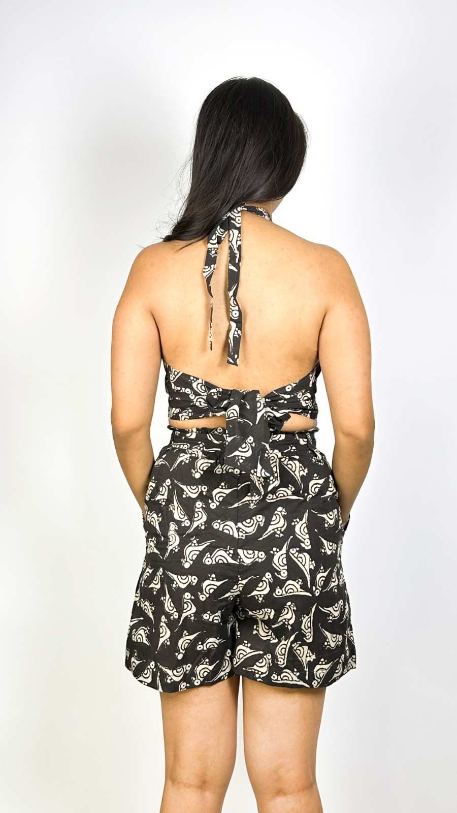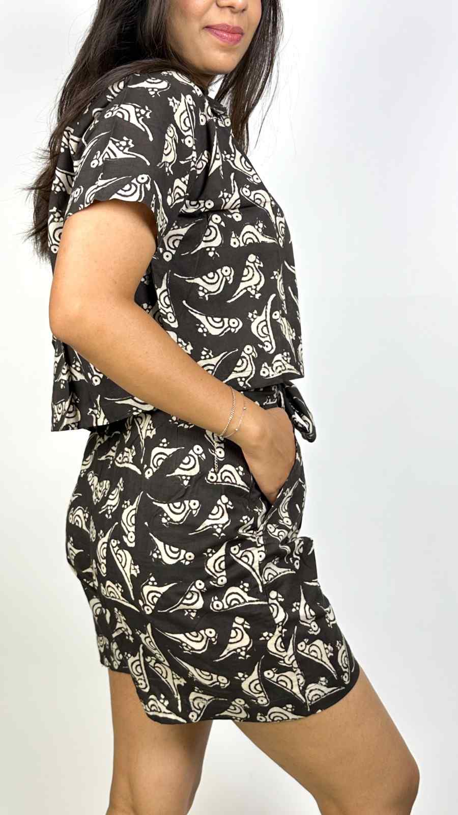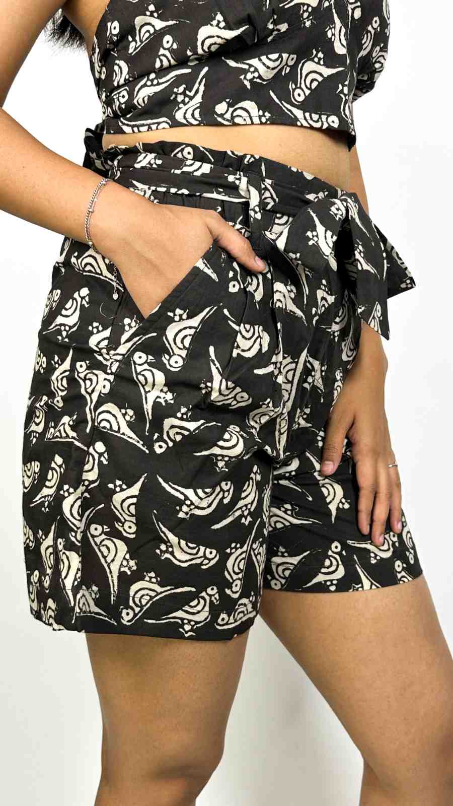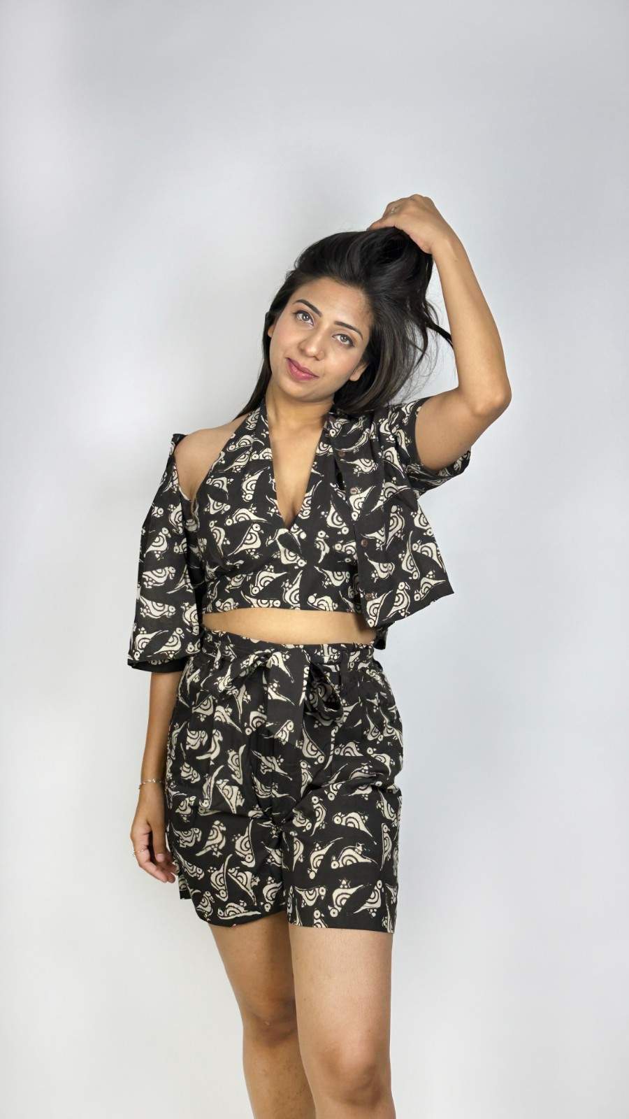 Three-piece co-ord set made using block printed fabric. It has a halter neck top, crop shirt and high waist shorts. Hand Block-Printed high waist shorts. It has elastic band on the back and a belt for better grip alongwith pockets on both sides. Hand Block-Printed halter neck top. It has to be tied from 2 sides- one behind the neck and second from the back. Block printed semi-formal crop shirt with half sleeves and functional wooden buttons in the front. A perfect summer bottoms. Made of pure cotton with finesse.