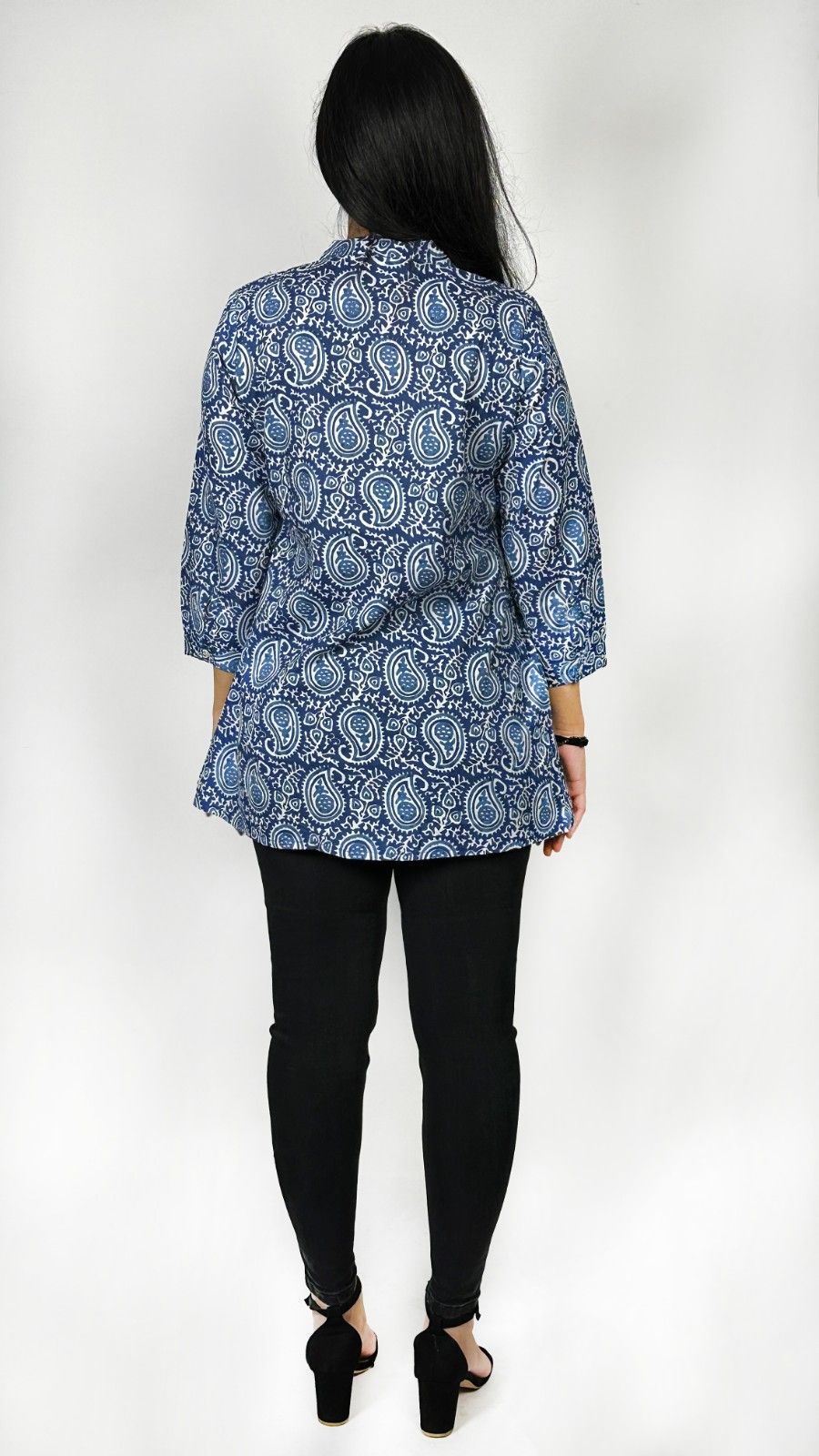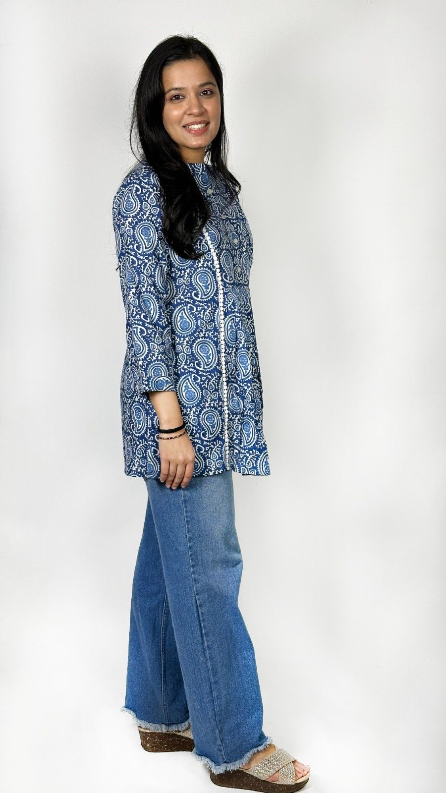 A screen-printed short cotton kurti emphasizing the princess line with lace detailing. Band collar with buttons for ease of wearing. Best suited for semi-formal occasions and colleges. Lightweight and breathable with a complete summer vibe and a few gathers in the front to add a feminine touch with 3/4th sleeves.