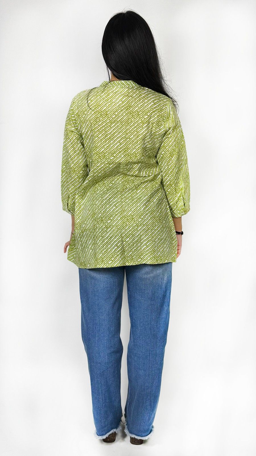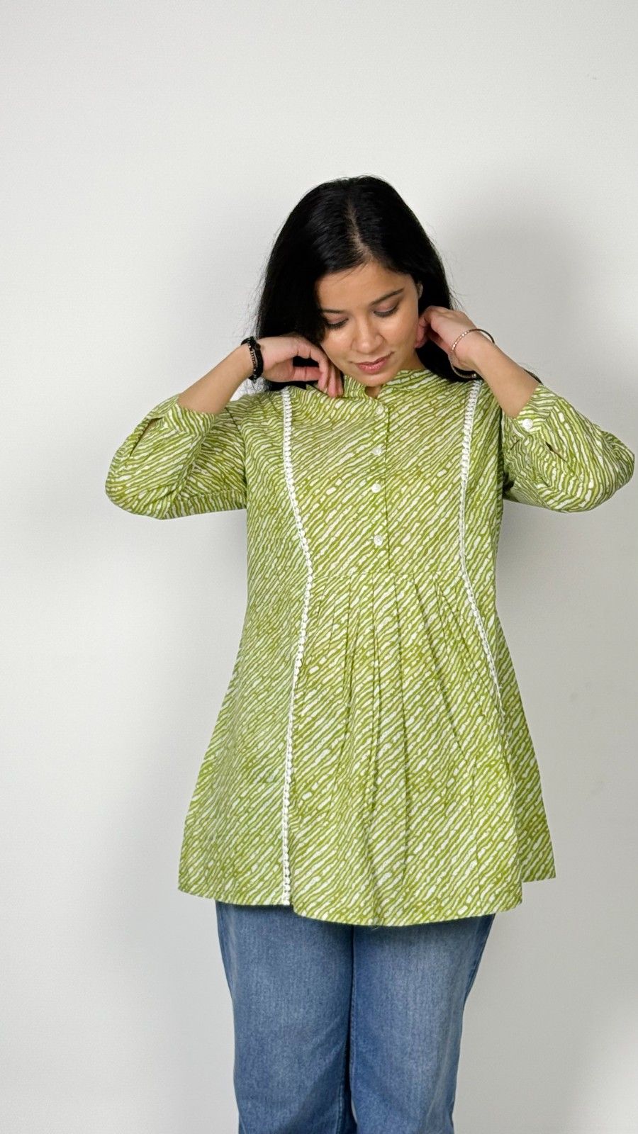 Lehariya printed short cotton kurti emphasizing princess line with lace detailing. Band collar with buttons for ease of wearing. Best suited for semi-formal occasions and colleges. Light weight and breathable with a complete summer vibe and a few gathers in the front to add a feminine touch with 3/4th sleeves.