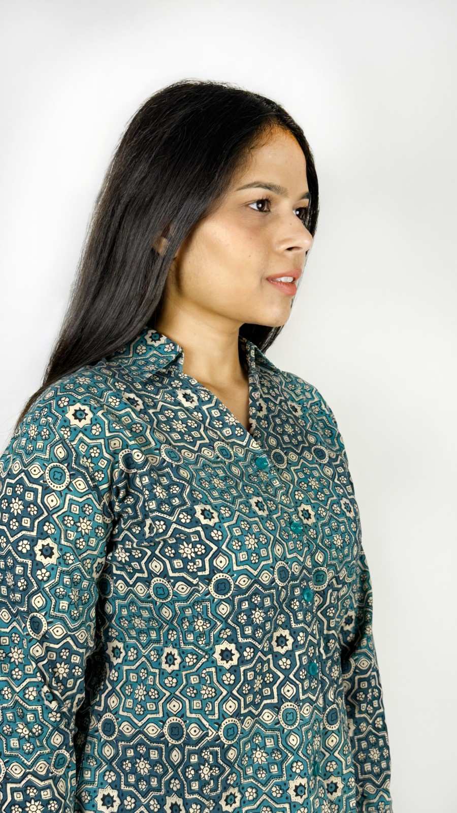 Block print formal shirt with full sleeves and cuffs. Well suited for formal events in summers.