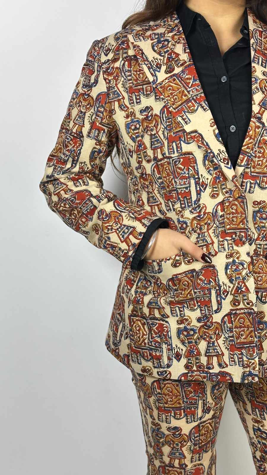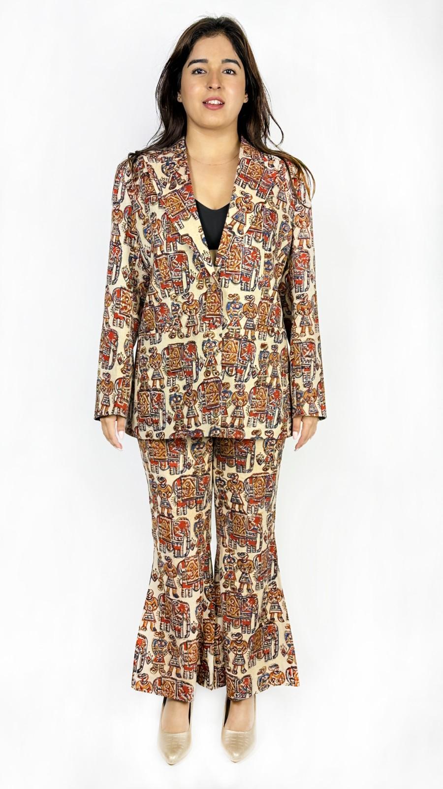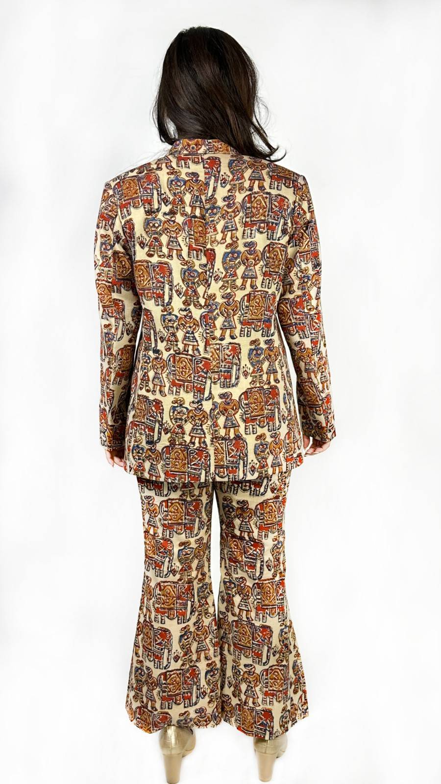Hand Block Printed Coat-Pant suit is an exclusive Aurasya attire curated to cater to your formal events' requirements with a pinch of Indian touch. This is a 2 piece set with a bell-bottom pants with pockets and a peak lapel coat with pockets. This coat has shoulder pads.