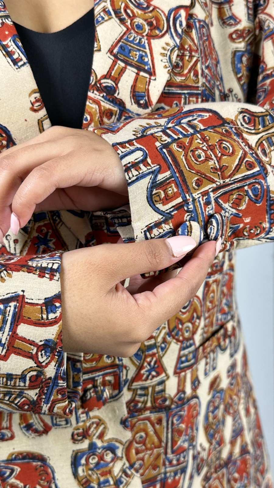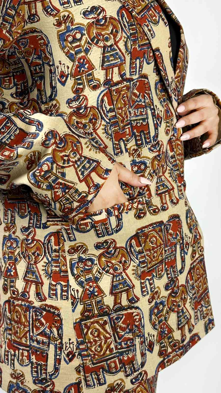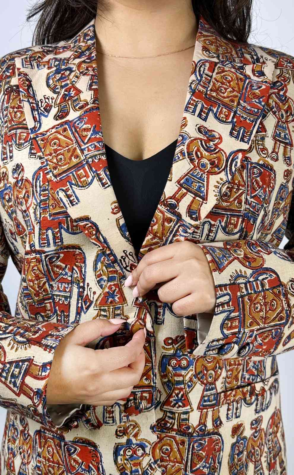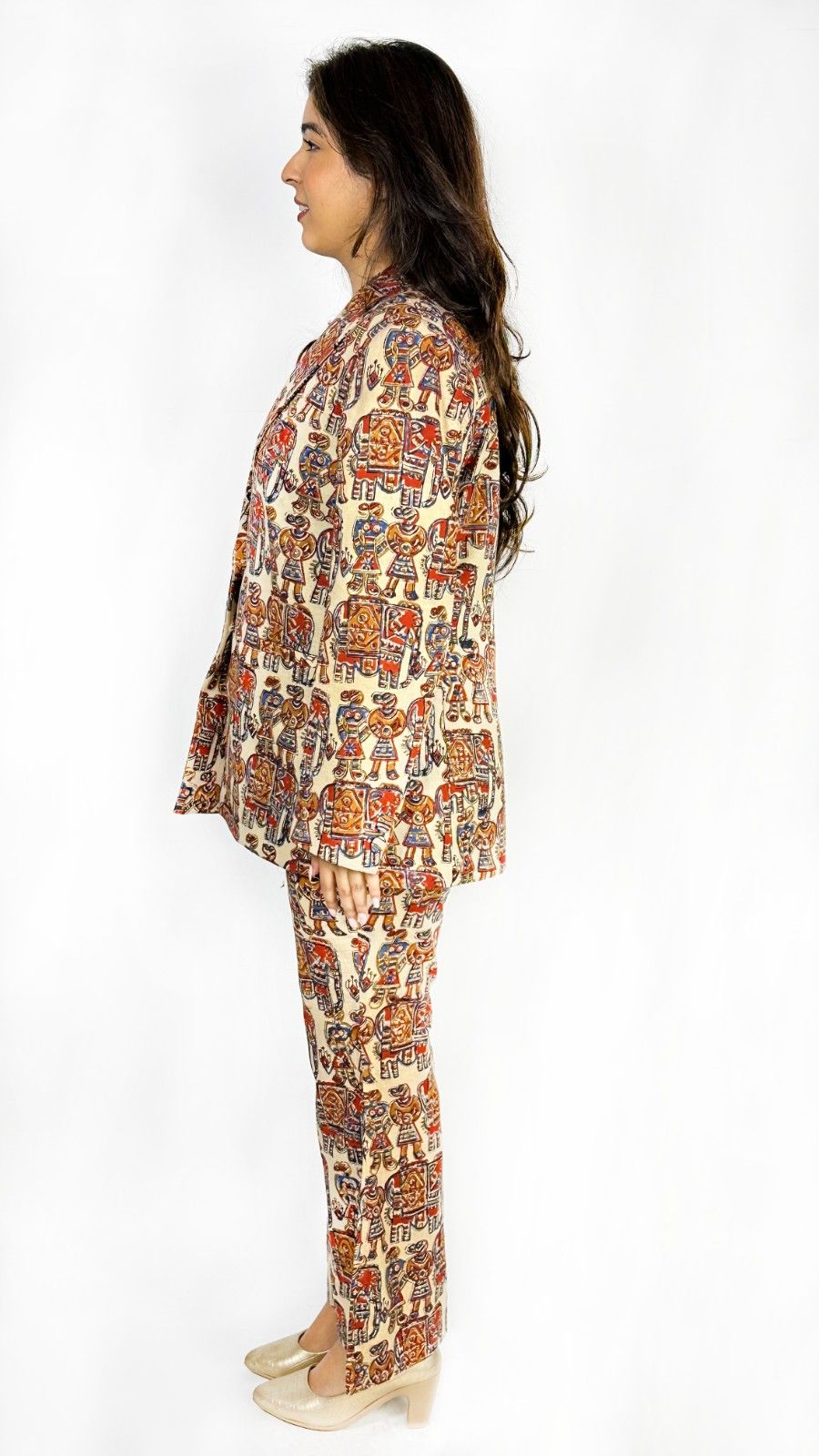 Hand Block Printed Coat-Pant suit is an exclusive Aurasya attire curated to cater to your formal events' requirements with a pinch of Indian touch. This is a 2 piece set with a bell-bottom pants with pockets and a peak lapel coat with pockets. This coat has shoulder pads.