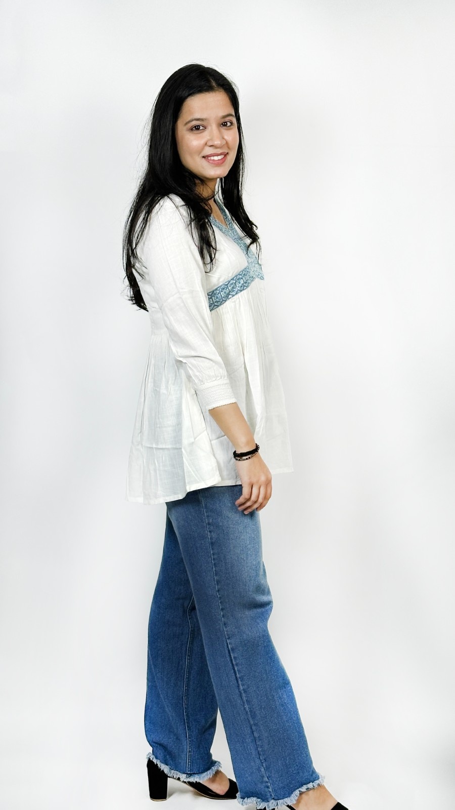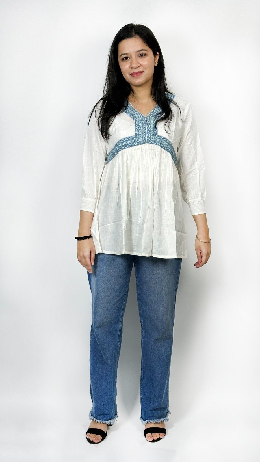 Campus-go-to stop with batik print detailing. Made with linen. It has 3/4th sleeves and gathers in the front for relaxation and style.